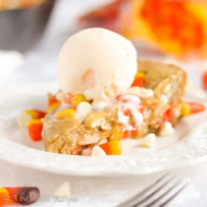 One thing most people don’t know about candy corn is how amazing it is to bake with! In fact, one of my favorite baking combos is candy corn and peanut butter. Seriously, BEST COMBO EVER. So, because I can’t get enough of this delicious duo, I decided to marry the two again in this incredible Pizookie!