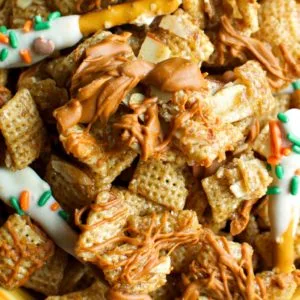 Caramel-coated Apple Cinnamon Chex squares, sliced almonds, white chocolate covered pretzels, and a cinnamon chip drizzle–easy and ADDICTIVE!