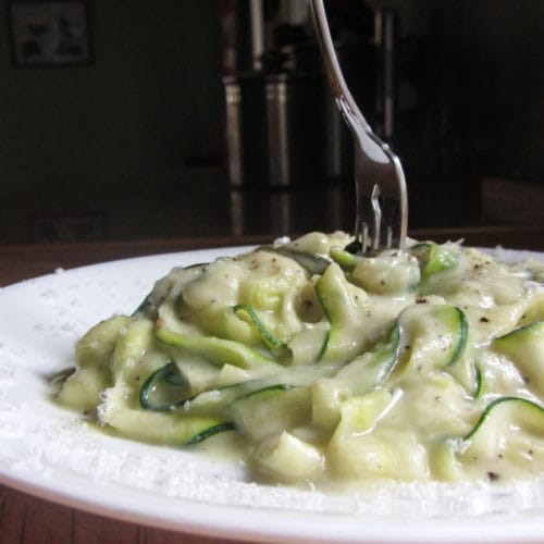 Delicate ribbons of zucchini tossed in a deliciously creamy and secretly healthy “Alfredo” sauce!