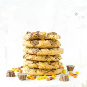 A soft, yet perfectly chewy cookie flavored with the richness of butterscotch and loaded with Reese’s pieces and Reese’s peanut butter cups!