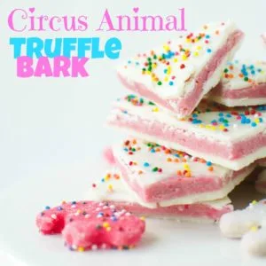 Only 4 ingredients required to make this sinfully delicious white chocolate bark filled with sweet circus animal cookie truffle filling!
