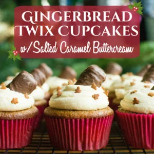 Perfectly moist and fluffy gingerbread cupcakes topped with the rich, salty sweetness of salted caramel buttercream and adorned with Gingerbread Twix bars!