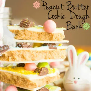 A thick, and I mean THICK, layer of rich peanut buttery cookie dough is sandwiched between the sweet vanilla creaminess of white chocolate, bedazzled with even more peanut butter happiness–Reese’s peanut butter eggs and tiny Reese’s peanut butter cups–and glitzed up with cute Easter sprinkles.