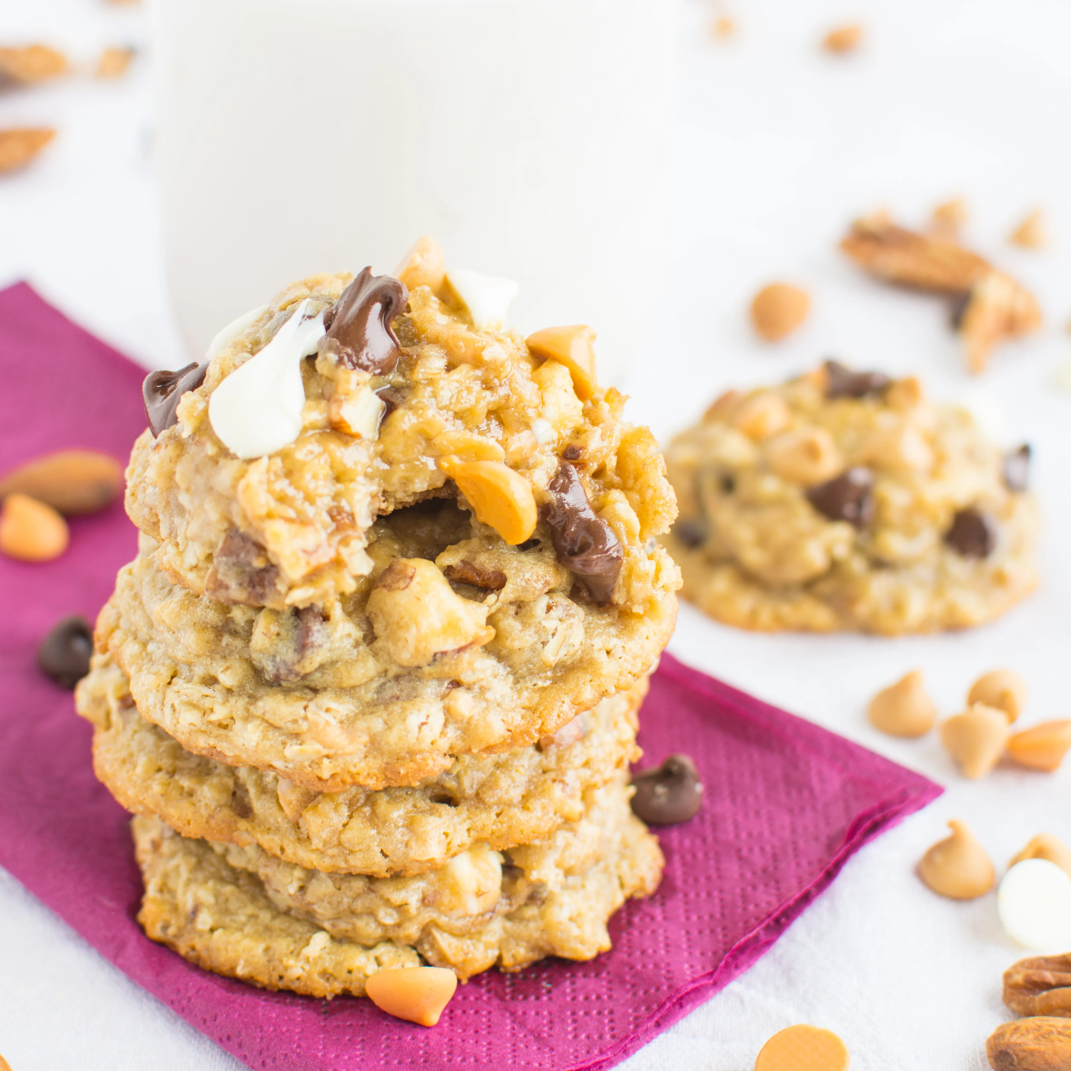 Not only are these cookies brimming with loads of chewy oats, crunchy almonds, and chopped pecans, but they also contain a trio–I mean, quartet of chips. Hey, I was NOT joking around when I said these cookies were STUFFED.