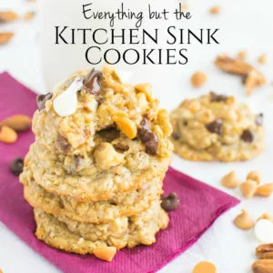 Soft and chewy oatmeal cookies LOADED with all the good stuff–pecans, almonds, chocolate chips, white chocolate chips, butterscotch chips, and peanut butter chips!