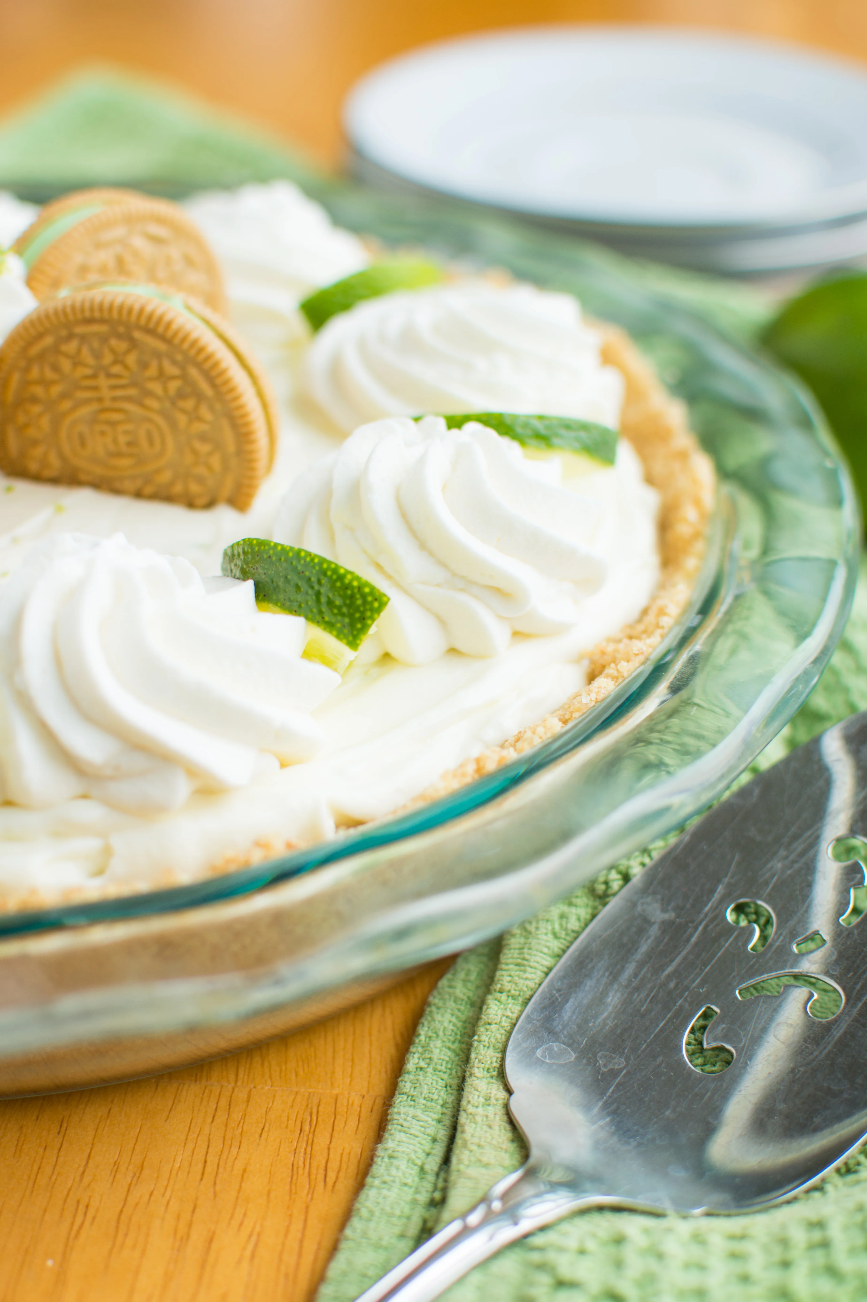 A no-bake pie that starts with a graham cracker crust filled with a layer of rich Key Lime Oreo truffle filling and a layer of citrusy white chocolatey mousse filling!