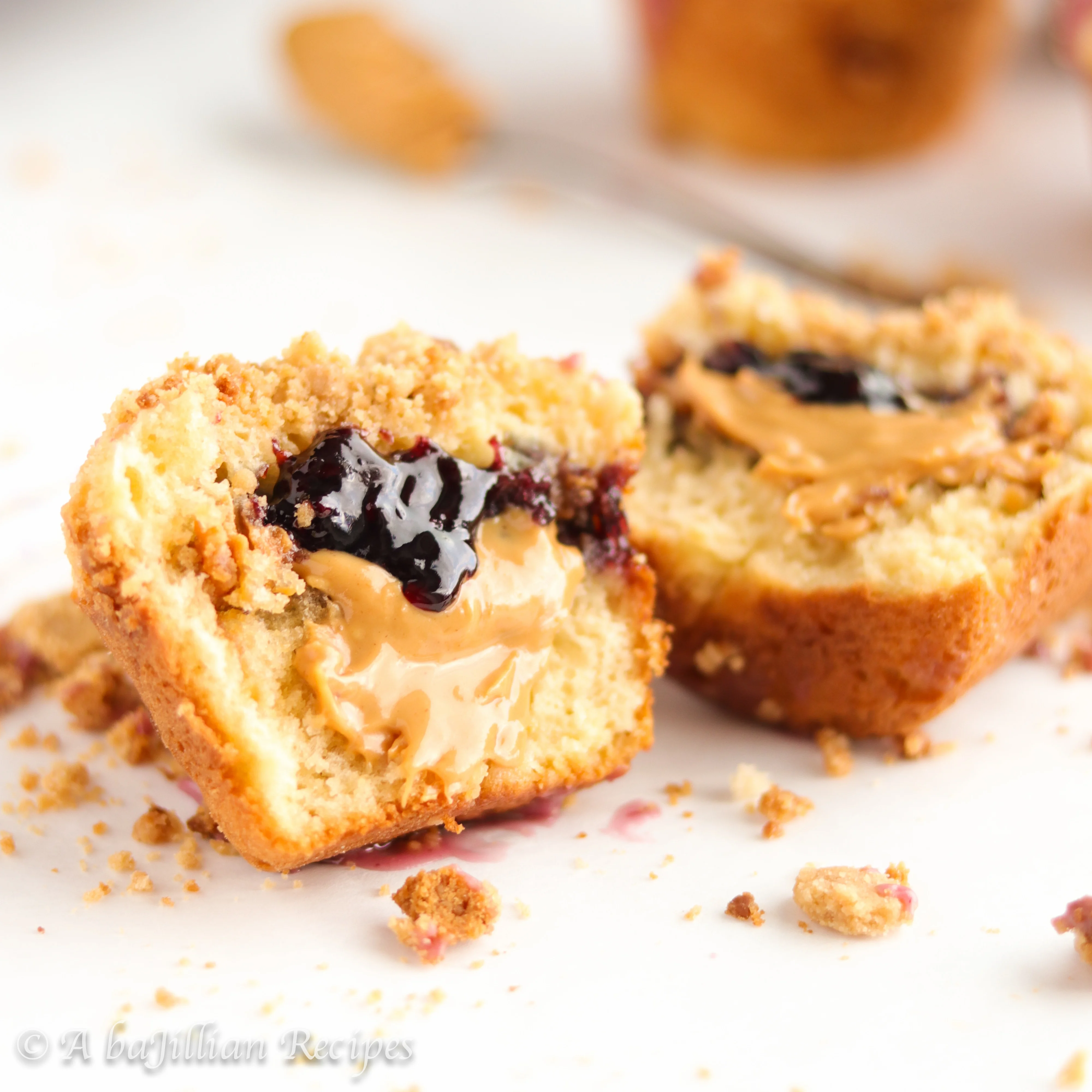 Fluffy muffins stuffed with creamy peanut butter and blackberry jam, topped with a peanut buttery streusel and a drizzle of blackberry icing!