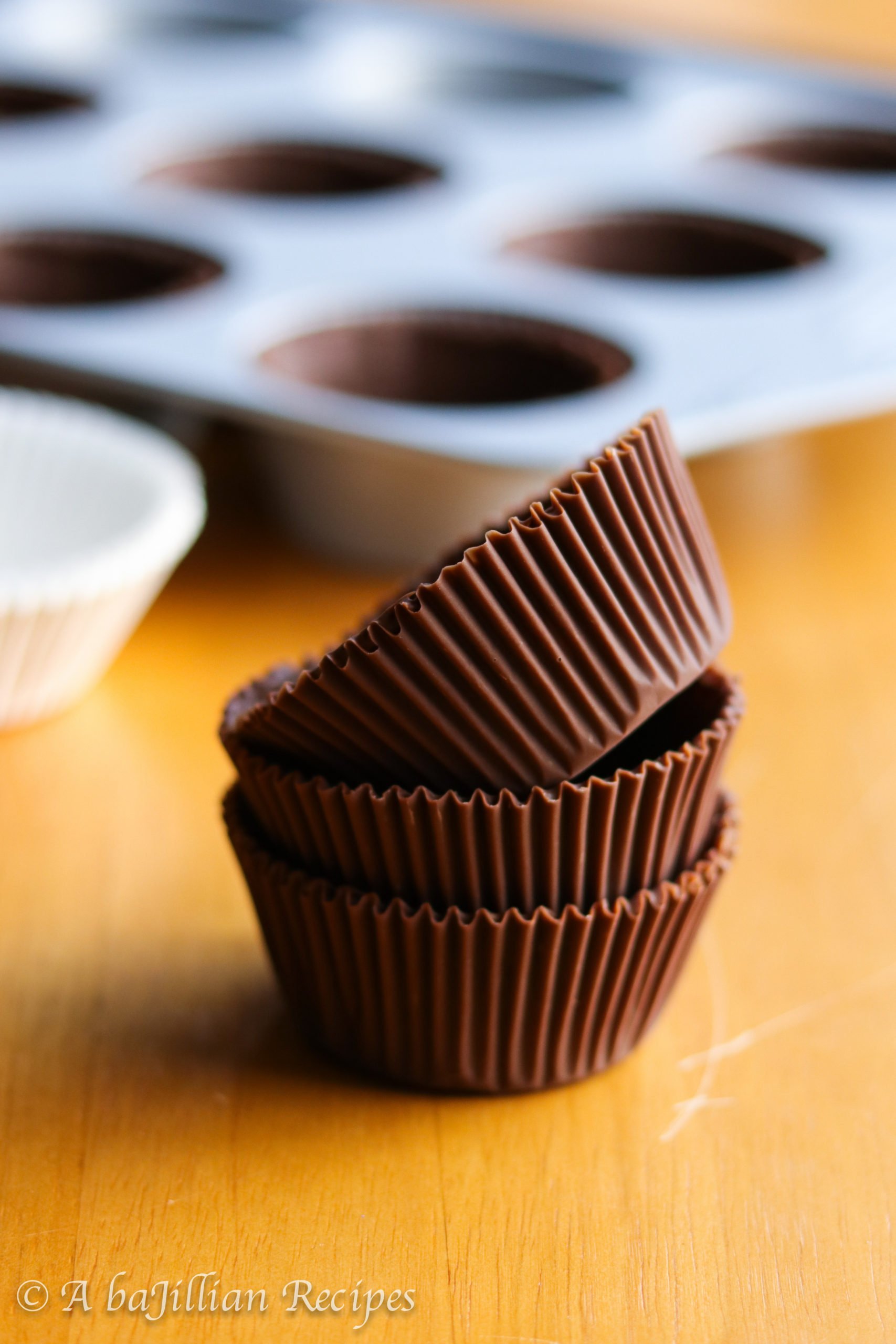 Once the chocolate has hardened (usually about 10-15 minutes), take the pan out and peel the paper liners off. The liners come off really easily, and the chocolate cups are pretty sturdy so they shouldn’t break as you peel the paper off.