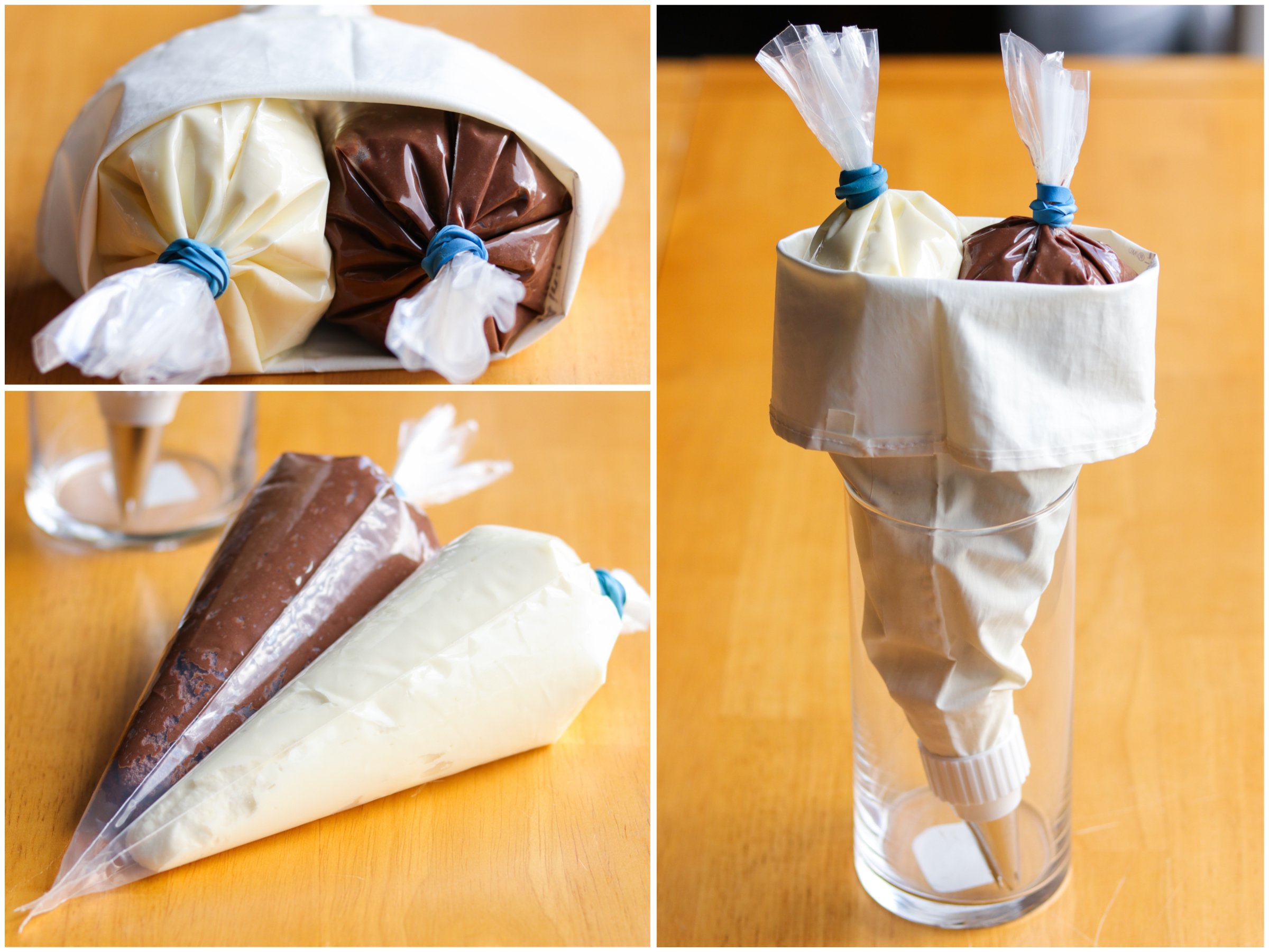 To swirl/intertwine the two mousses, I poured each mousse into a separate pastry bag. Then I placed both bags into one large pastry bag fitted with a Wilton 1M tip.