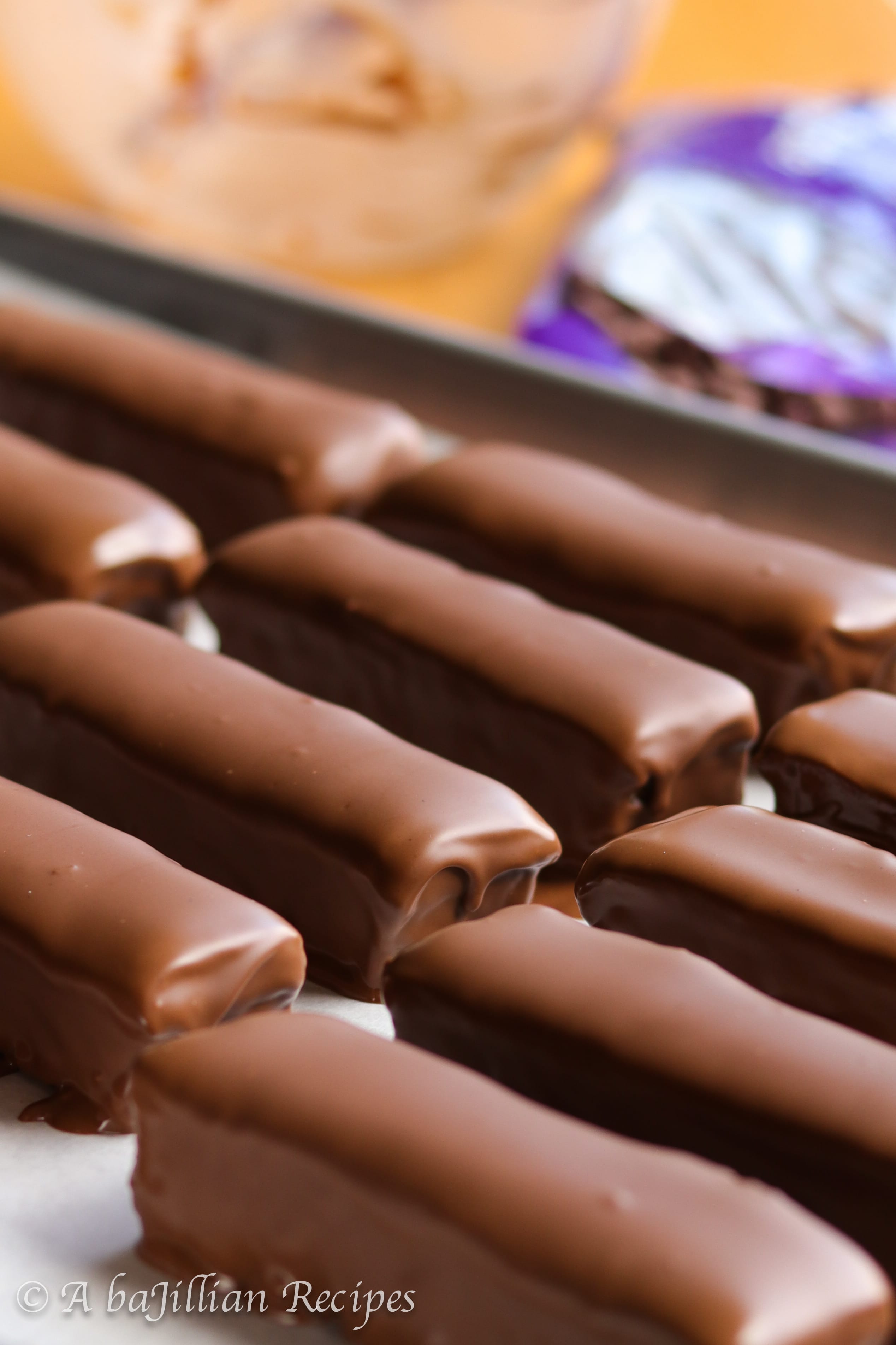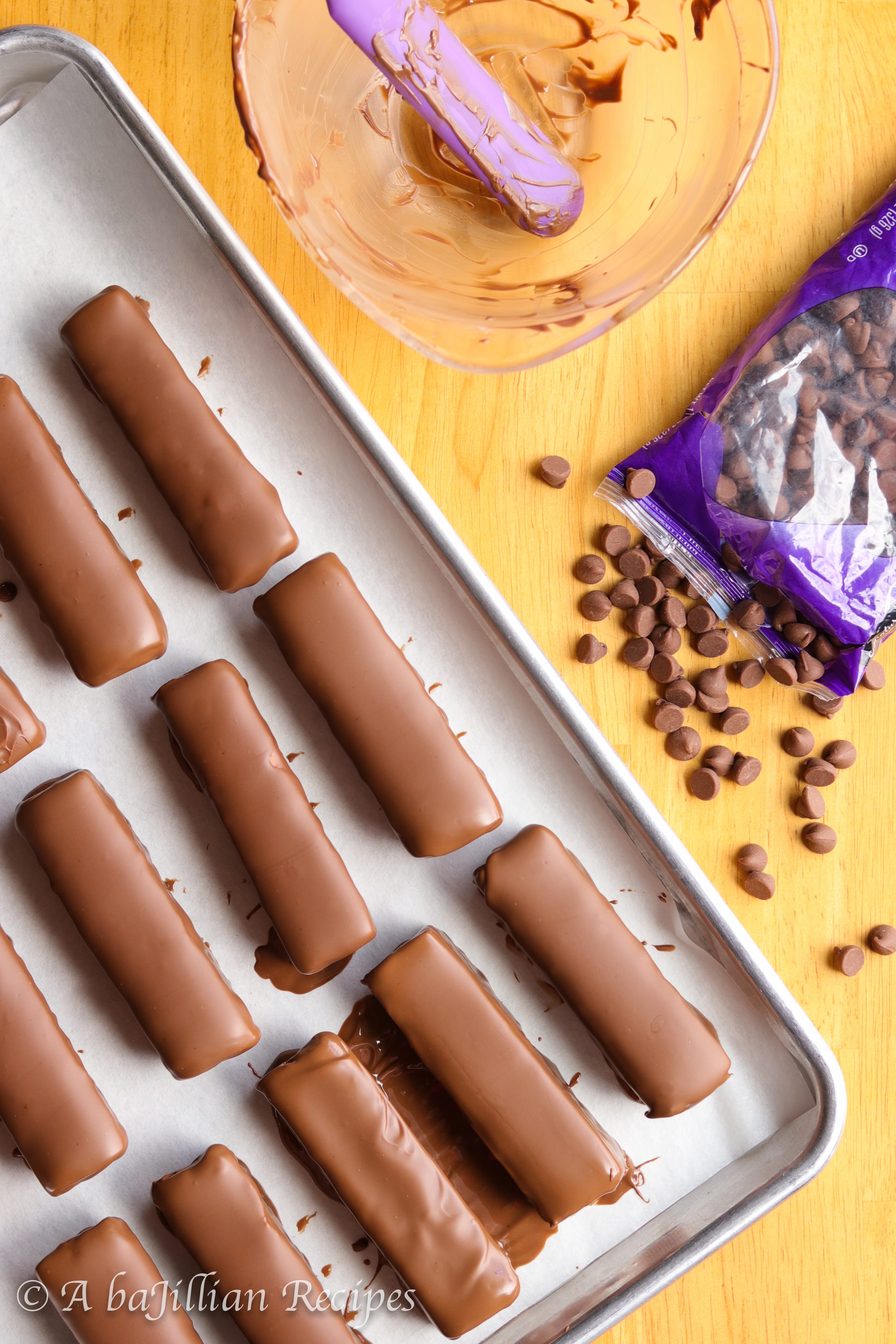 As far as chocolate-dipping goes, I’ve found that the best way to coat the bars was to lift the bar with one fork, lower the bottom half into the melted chocolate, lift it above the bowl of chocolate, then use a spoon to ladle the melted chocolate over the bar. Once everything has been coated in chocolate, I tap the fork on the side of the bowl to remove any excess chocolate, then carefully place the bar onto a lined cookie sheet.