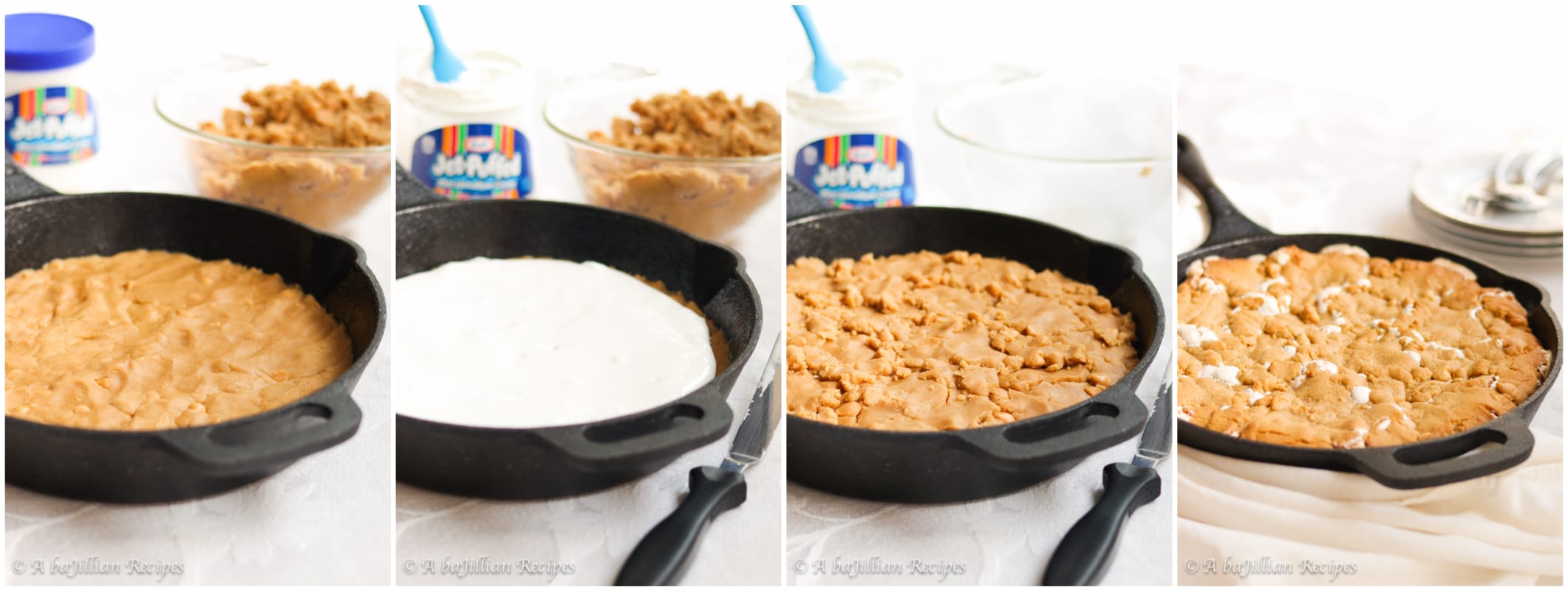 - Press about half of the dough evenly into the cast iron skillet. Spread the marshmallow creme on top. Take chunks of the remaining dough, flatten slightly, and layer them side by side on top of the marshmallow creme. Try to cover as much of the marshmallow creme as possible.