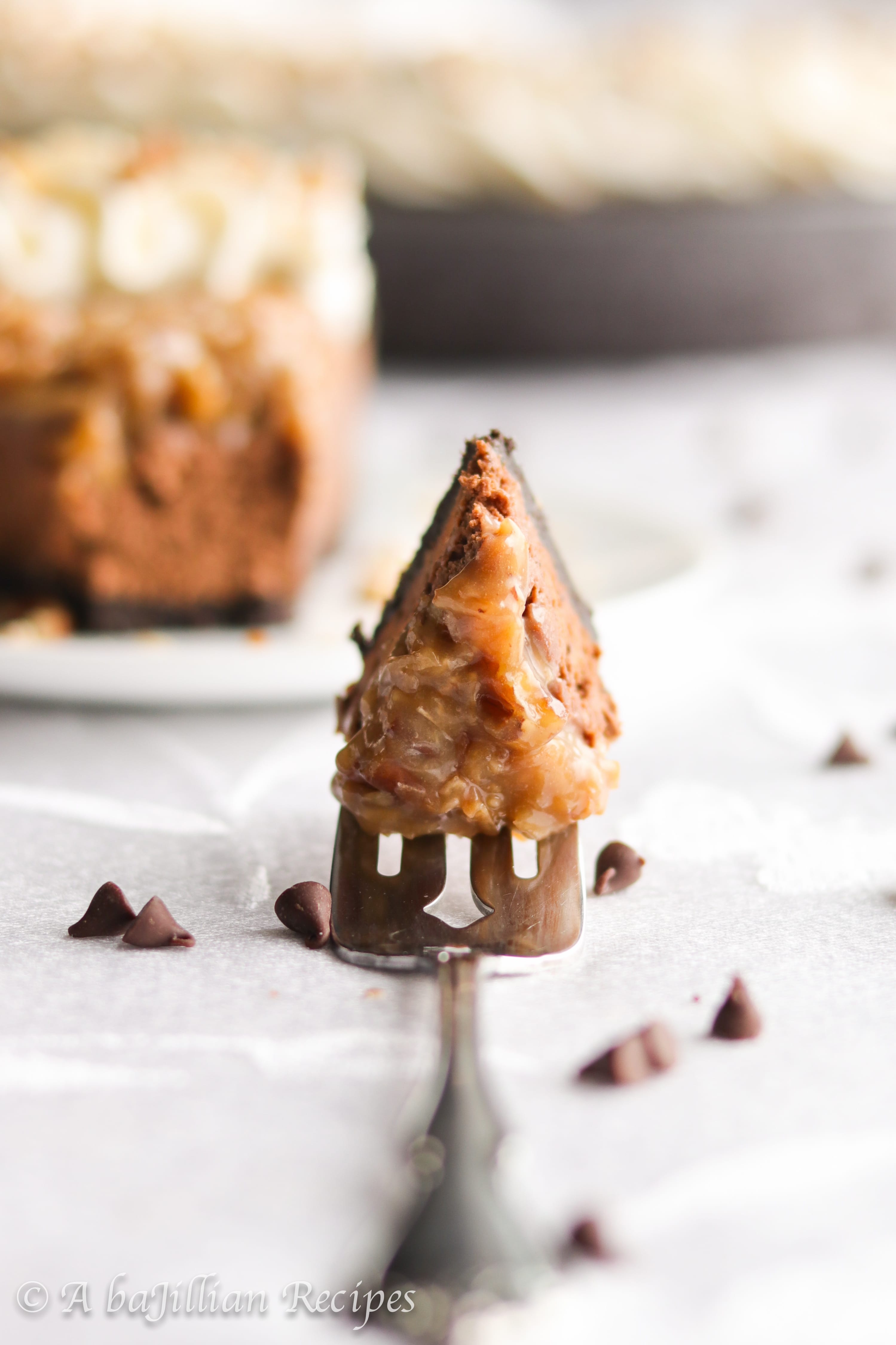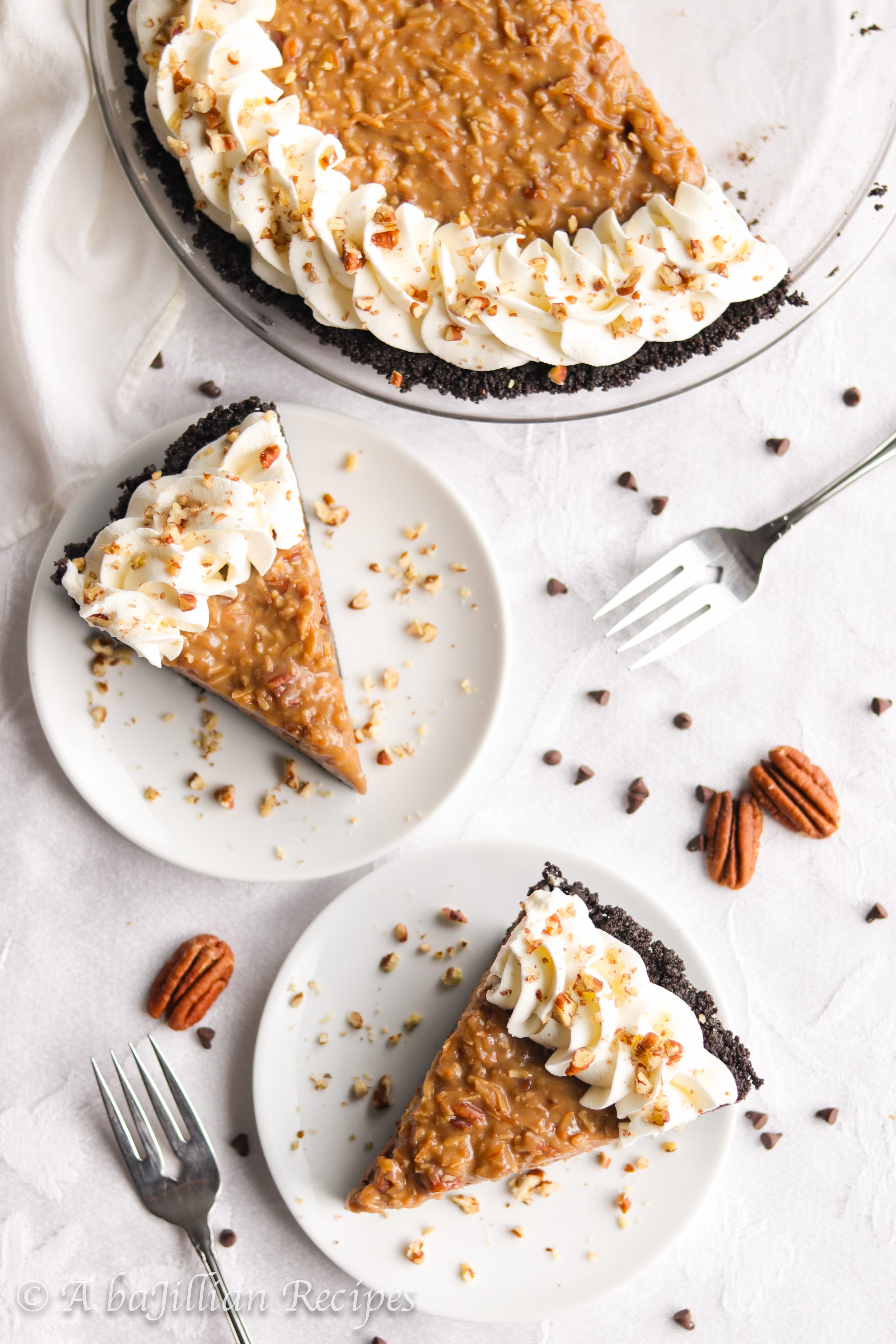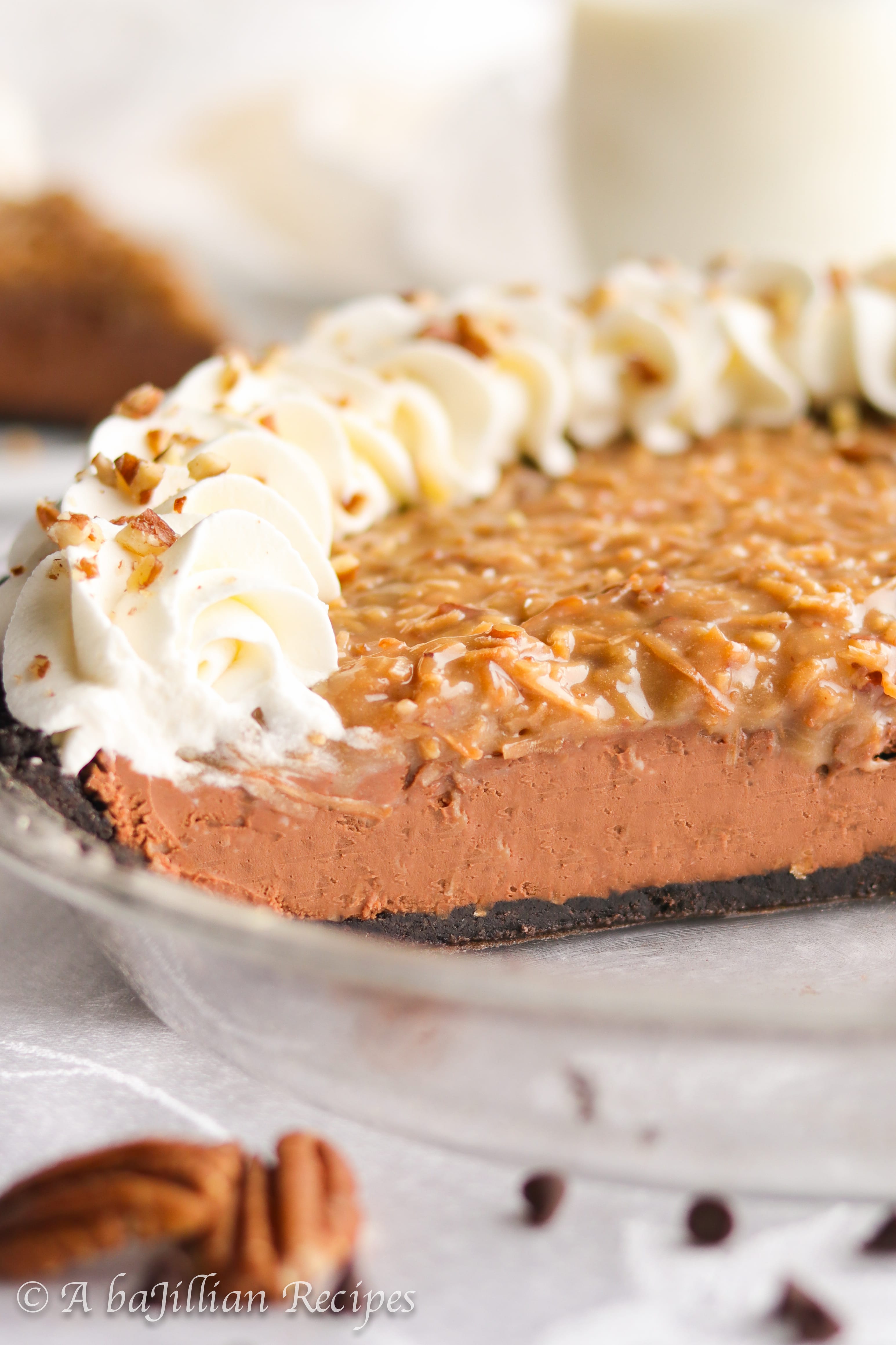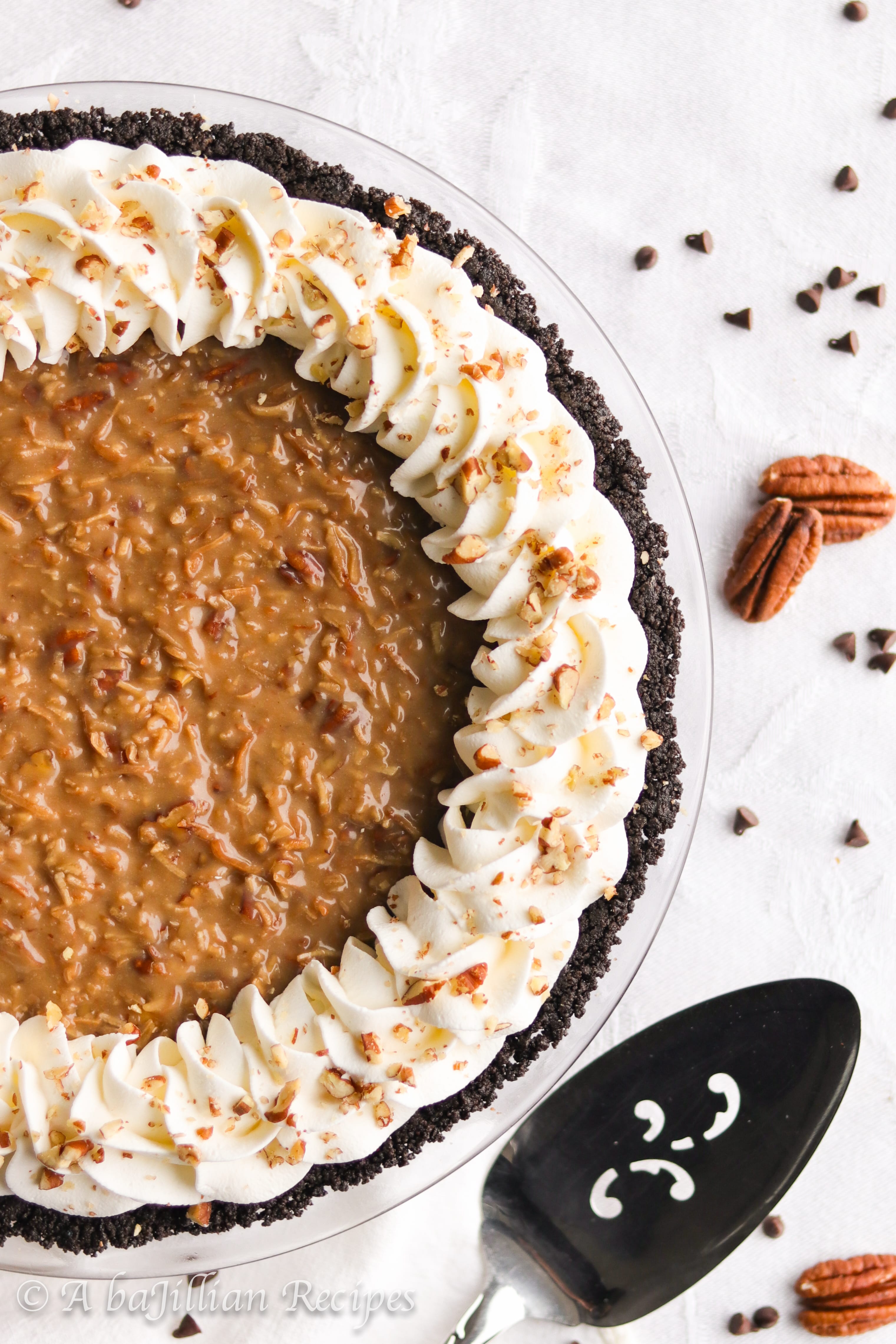 - Pour chocolate filling into the crust and smooth out evenly with a spatula. Spread the cooled coconut pecan topping over the chocolate filling. Chill in the refrigerator for at least 4 hours or overnight.
