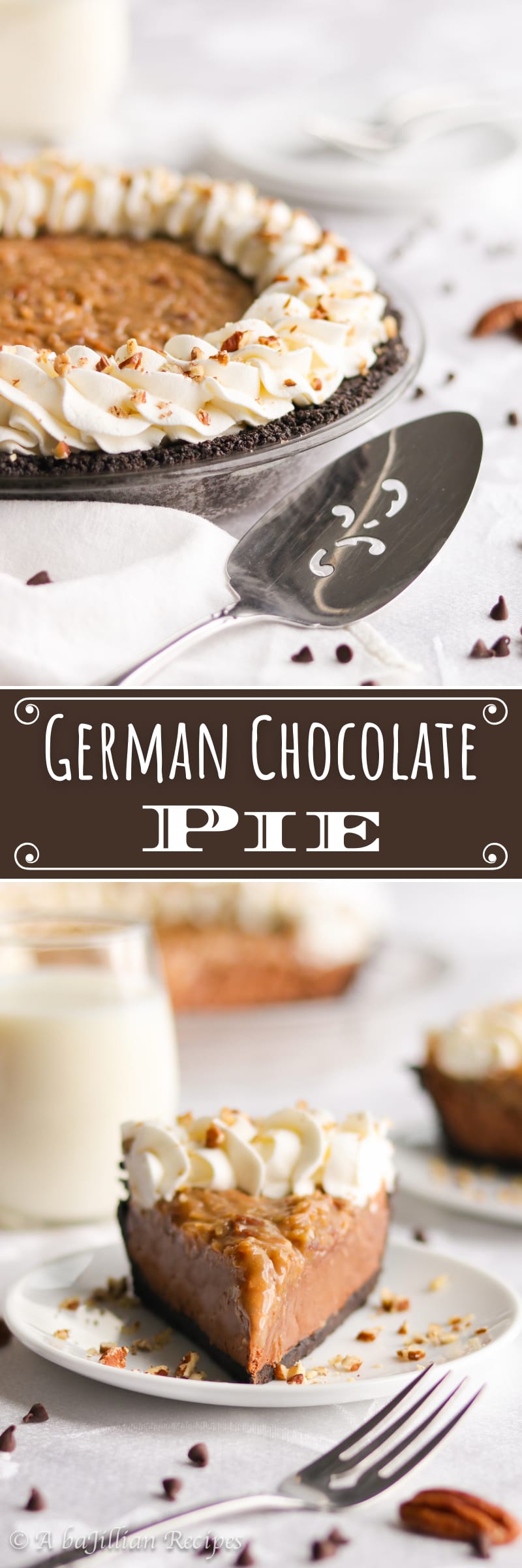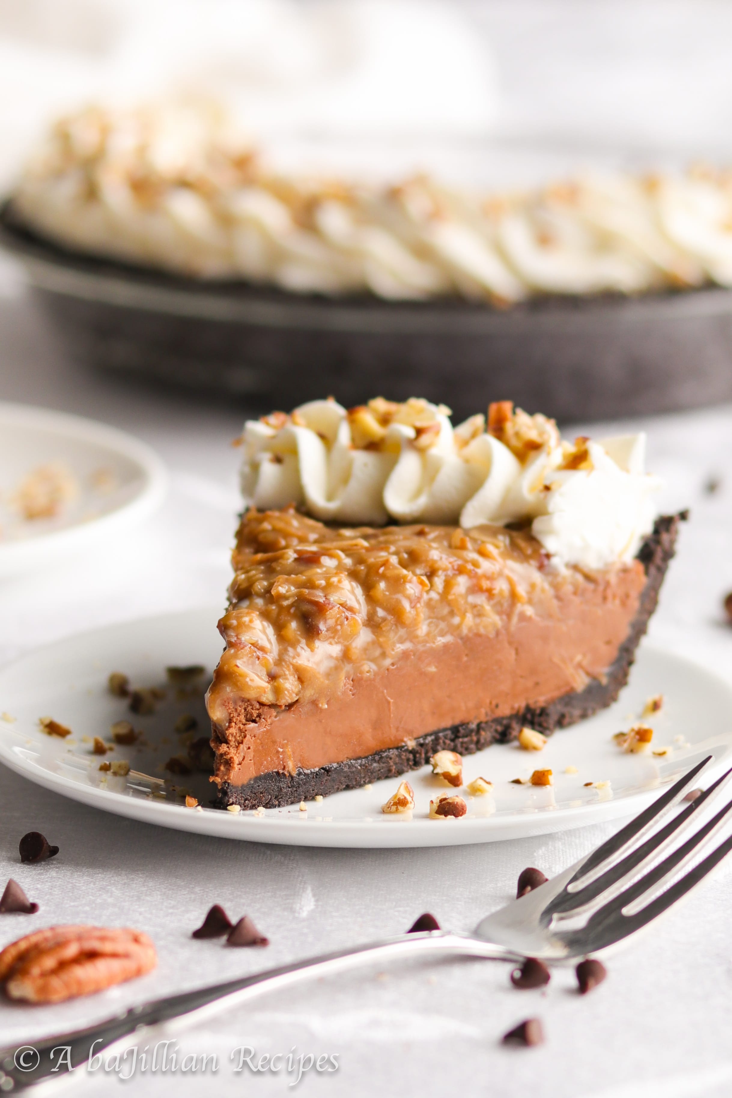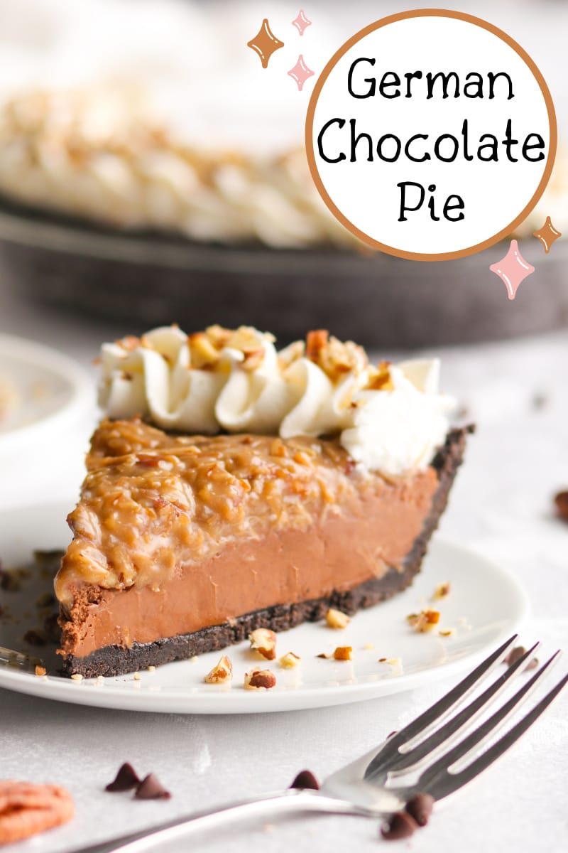 This German Chocolate Pie has it all–a crispy chocolate cookie crust, decadent dark chocolate filling, ooey gooey toasted coconut-pecan topping, and swirls of whipped cream!