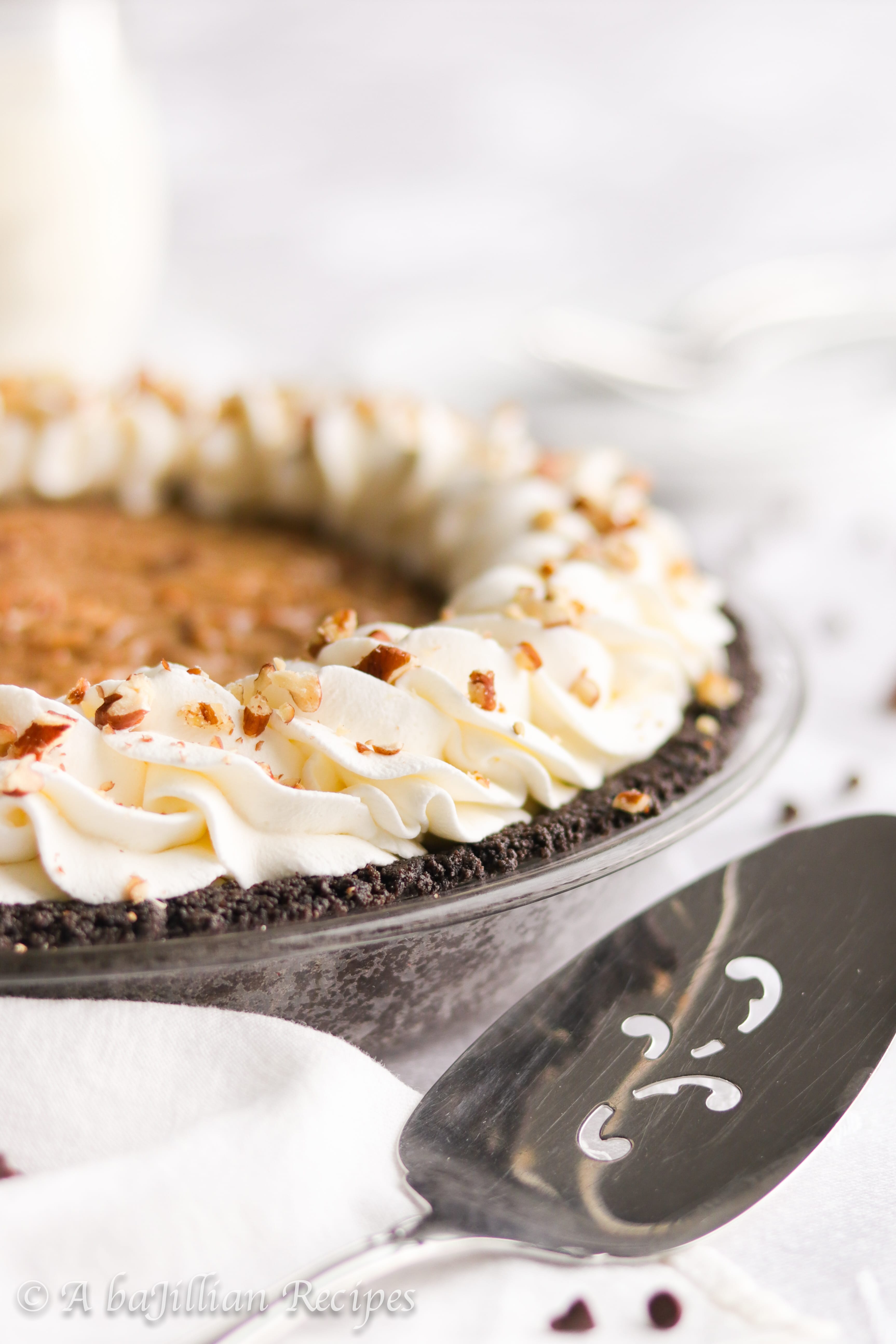 - Decorate border with freshly-whipped cream and chopped toasted pecans. Slice, serve, and enjoy!