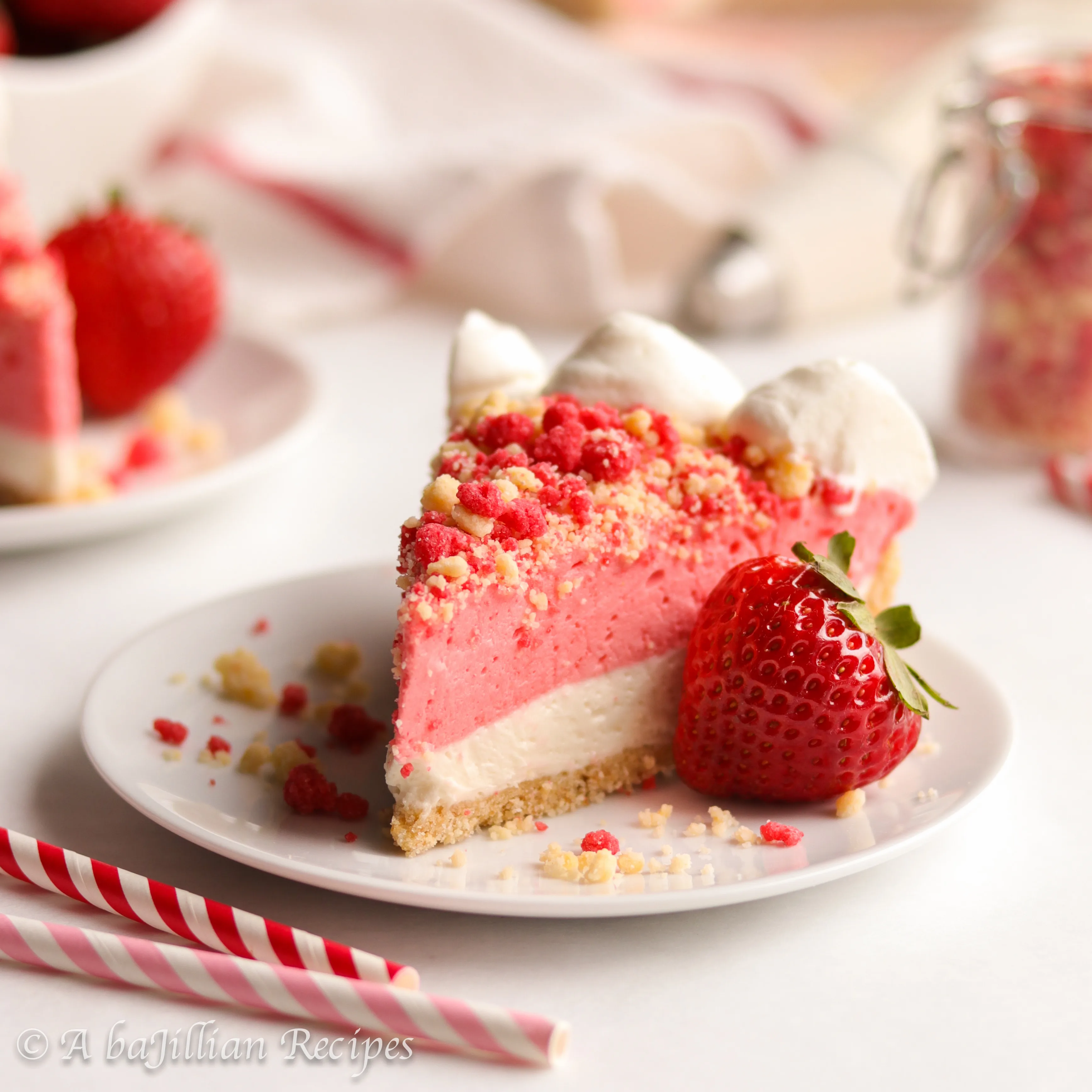 While this pie isn’t the same exact thing as a Strawberry shortcake Bar, it definitely tastes incredibly similar. It’s supremely creamy, packed with strawberry sweetness, and topped with the most amazing crispy crunchy strawberry vanilla crumbles! What more could you ask for??