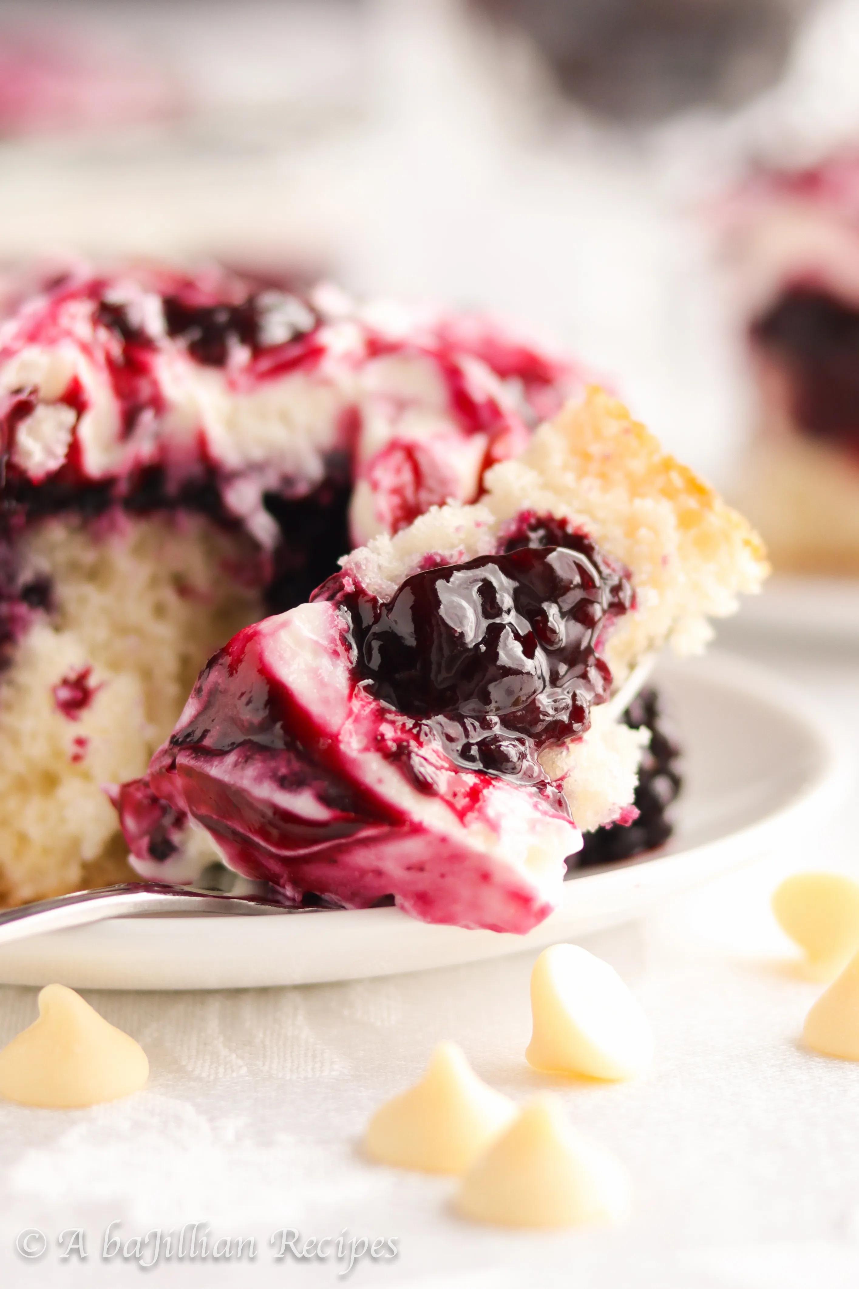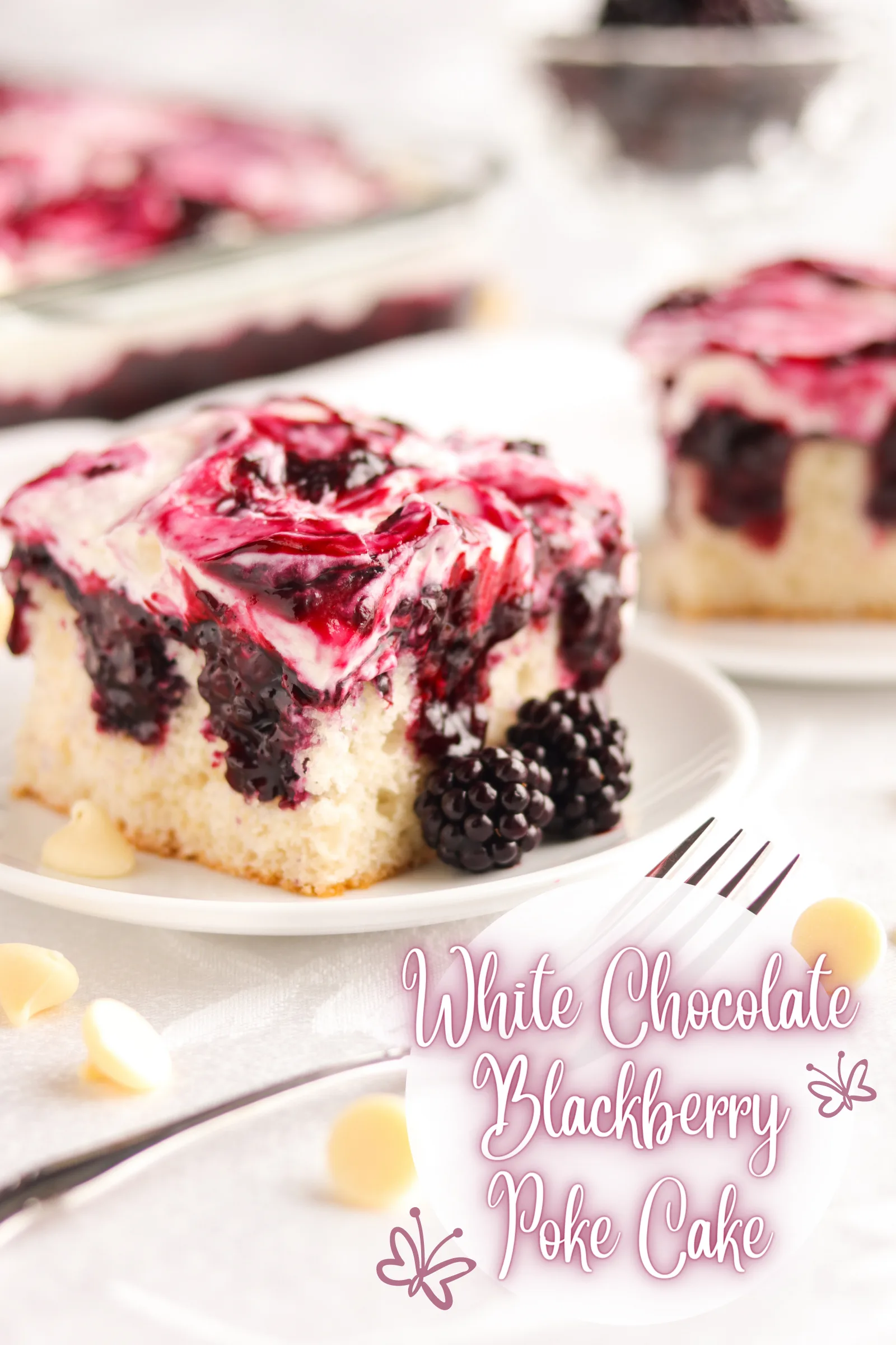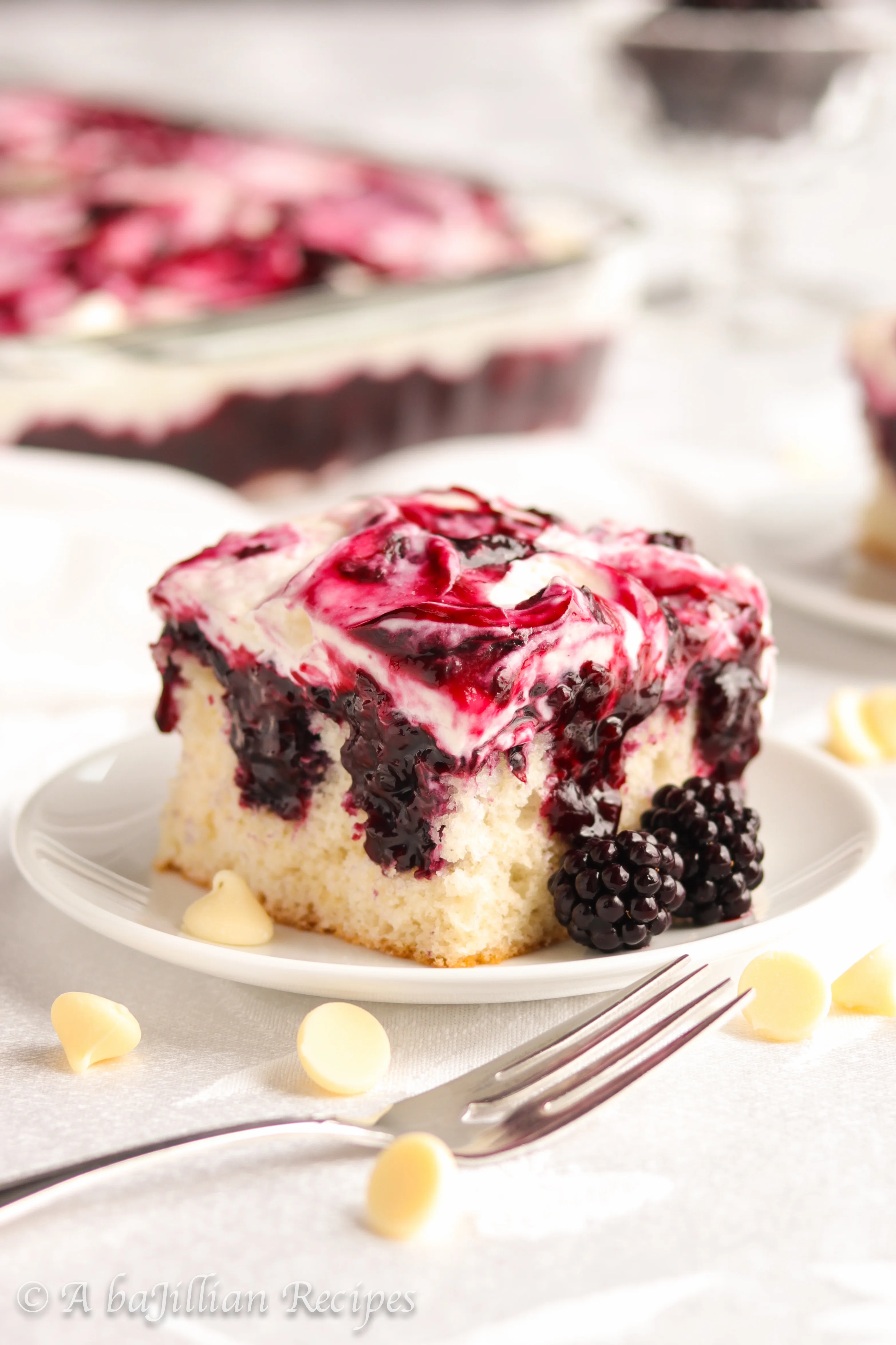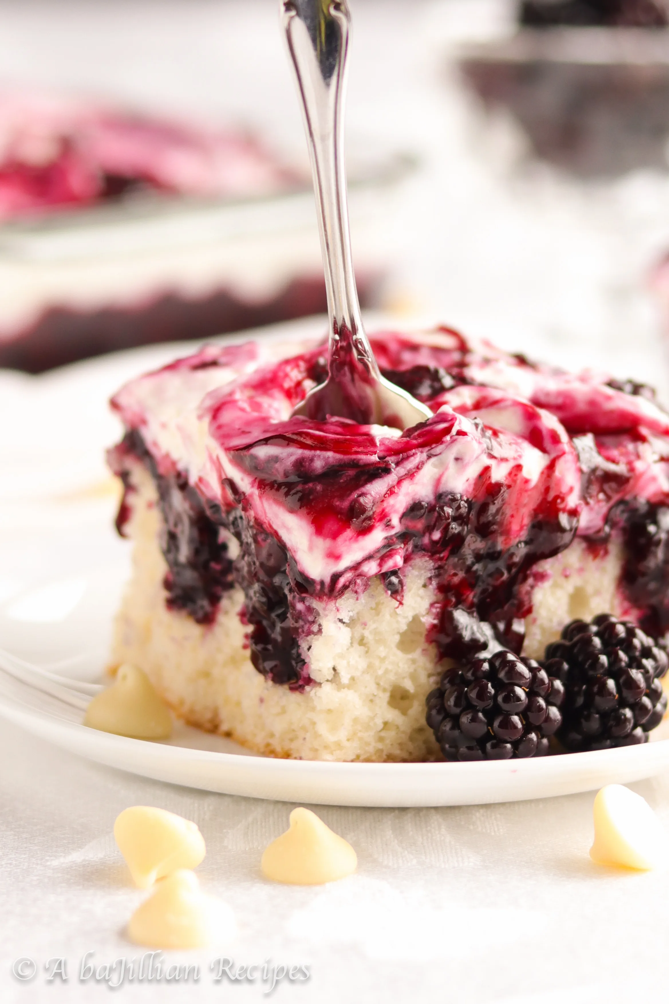 Delicate white cake, homemade blackberry topping, and lusciously creamy white chocolate topping–this White Chocolate Blackberry Poke Cake will have you licking every last crumb off your plate!