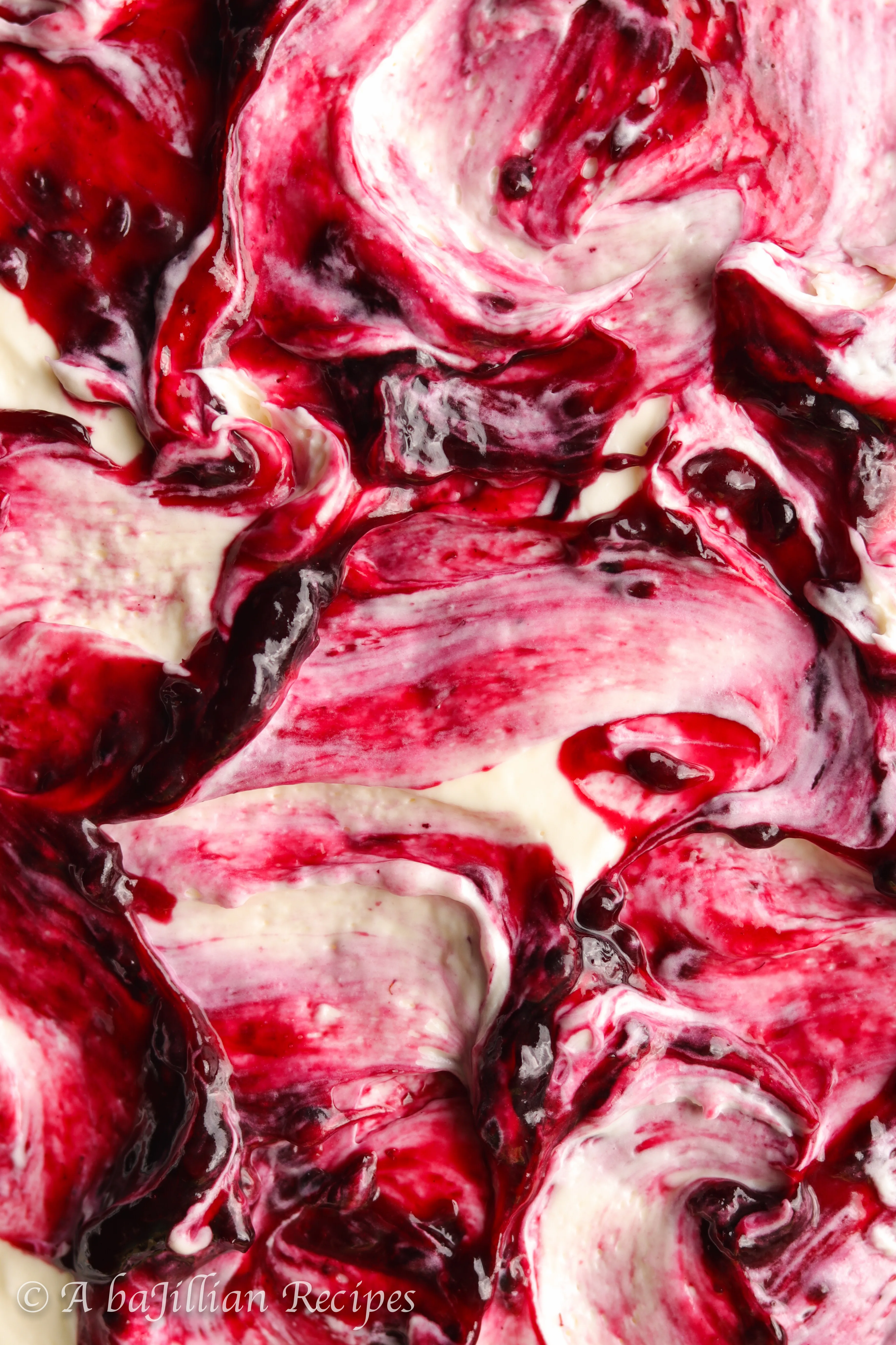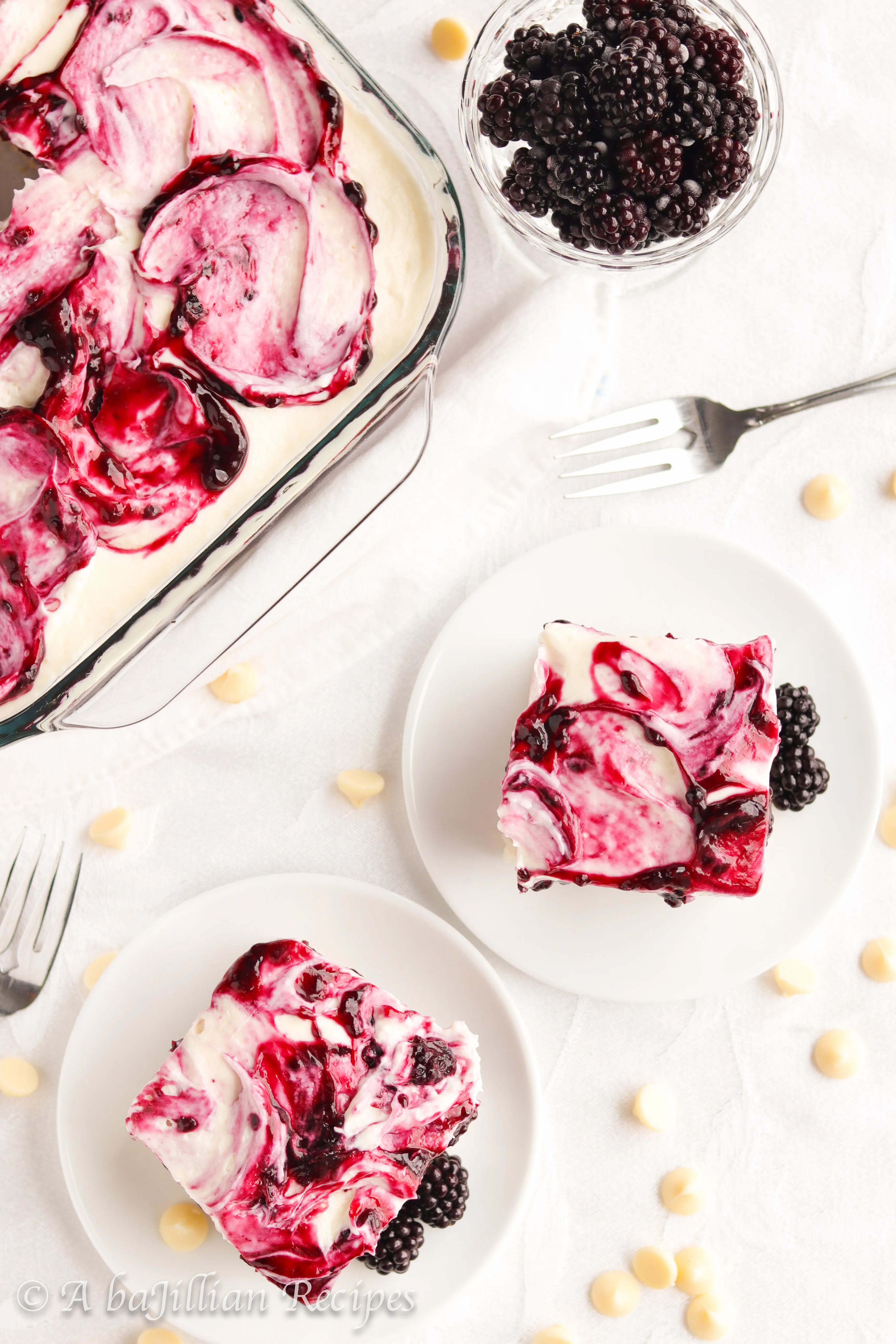 - Dollop white chocolate cream topping evenly over the blackberry topping layer. Use a butter knife or offset spatula to carefully spread the cream topping into an even layer. Drizzle the reserved blackberry topping on top, then use the back of a spoon or an offset spatula to swirl figure-eights into the topping.