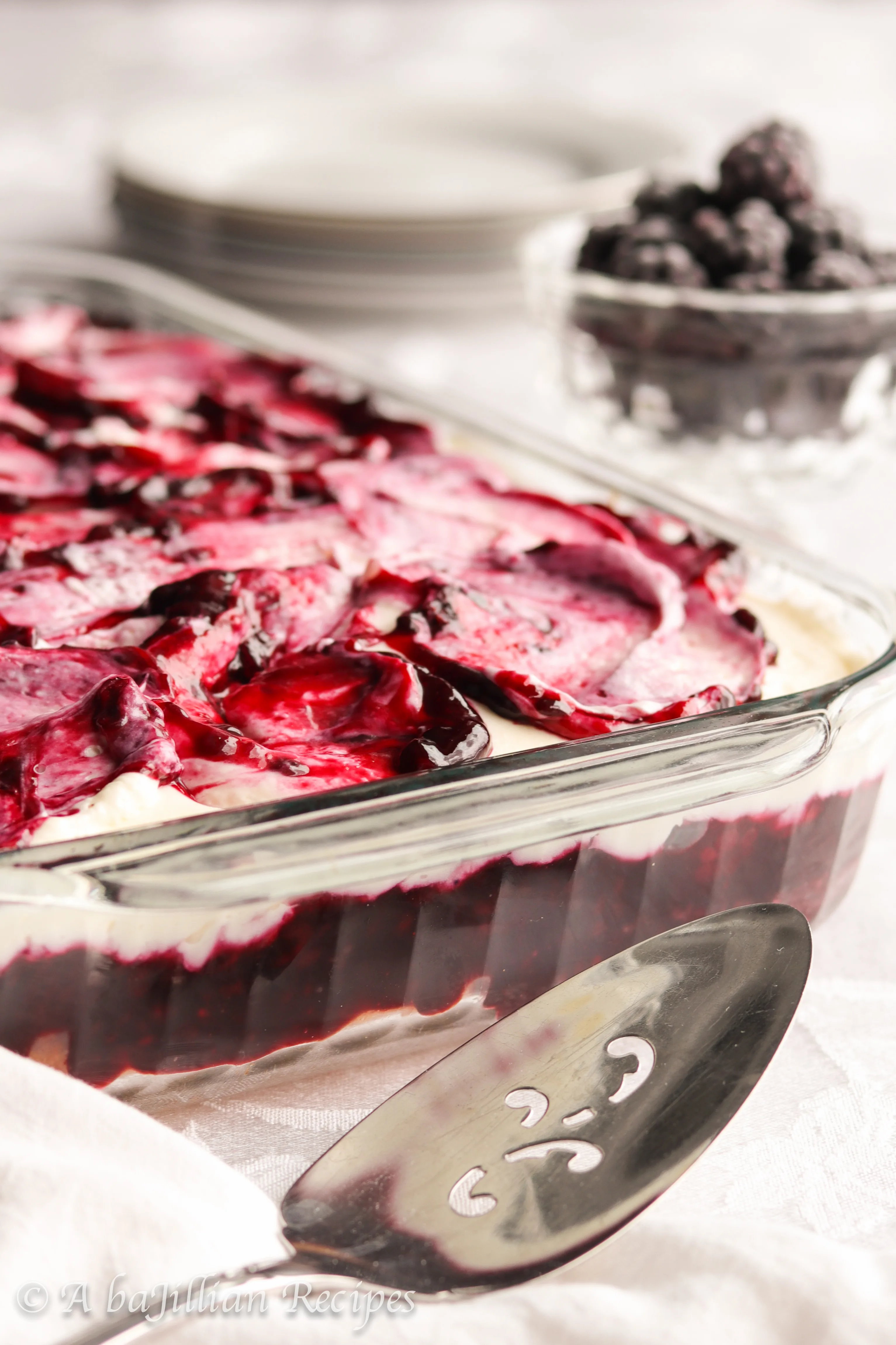Now BEFORE you pour the blackberry topping onto the cake, make sure to remove about 1/4 – 1/3 cup of it first. This will be used on top of the white chocolate cream topping. After you pour the blackberry topping on top of the cake, you might need to use a skewer or toothpick to push the berry topping into the holes.