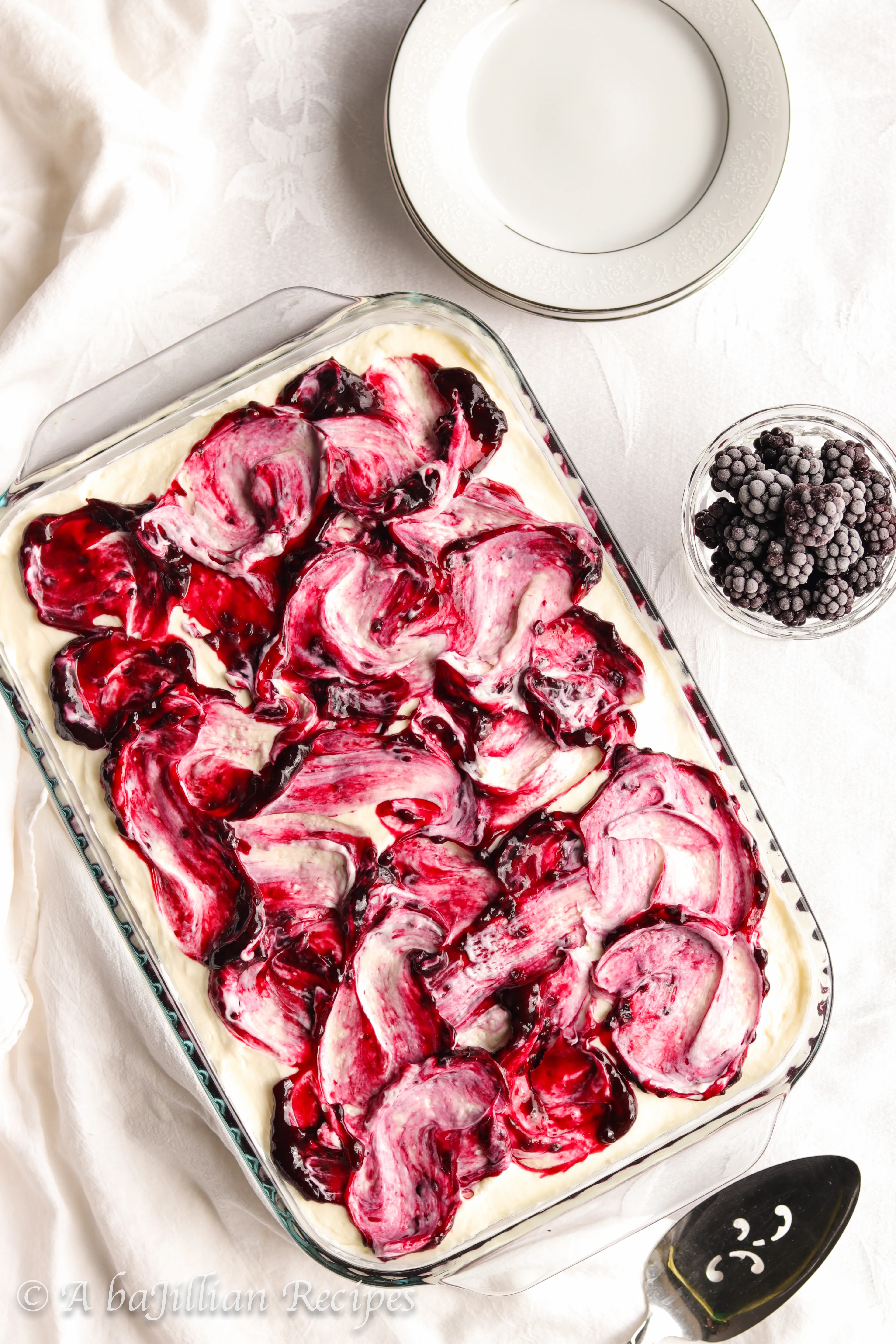 - Reserve 4-5 tablespoons of the blackberry topping, and pour the rest on top off the cake. Spread the topping into an even layer. If necessary, use a skewer or toothpick to push the topping down into the holes.