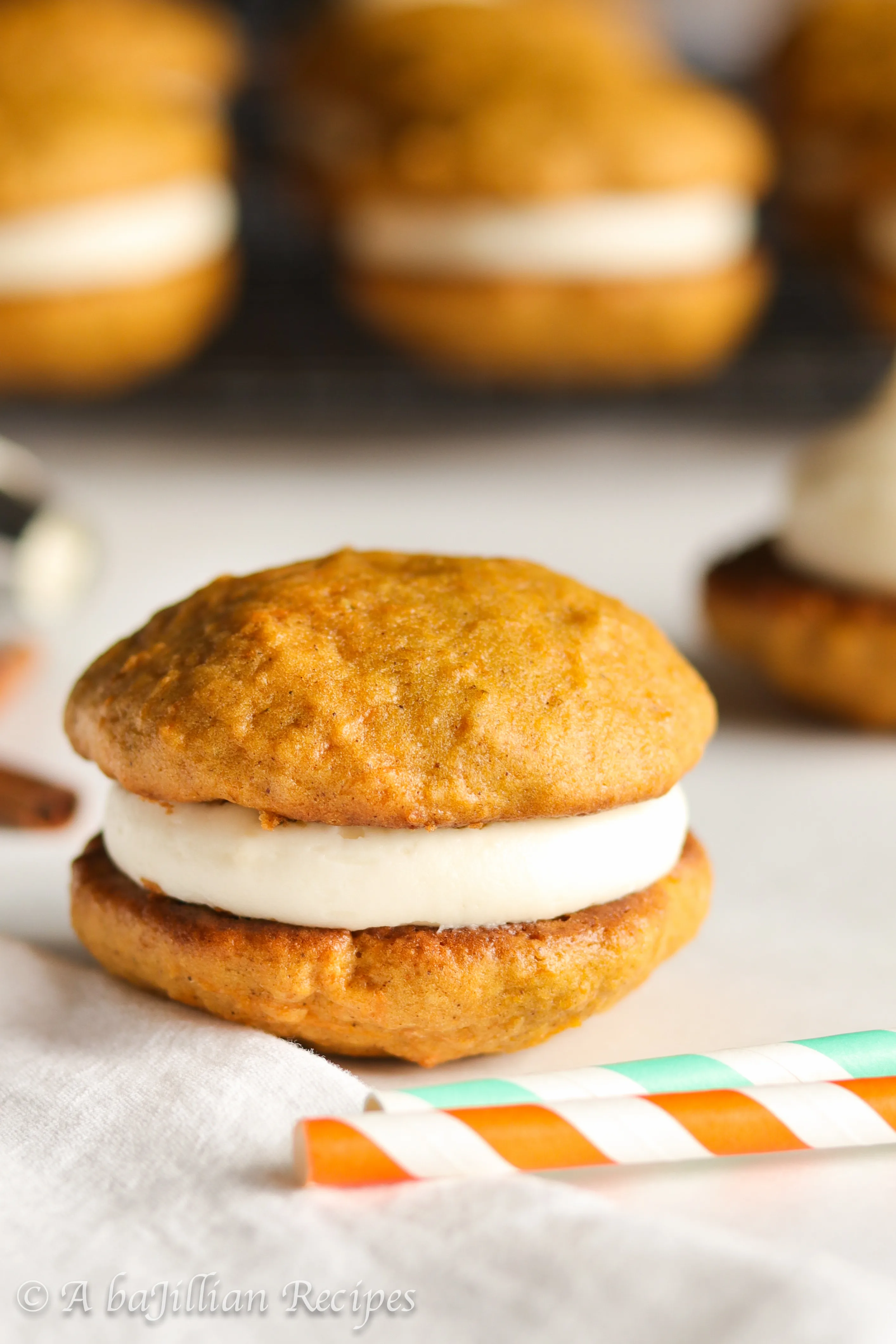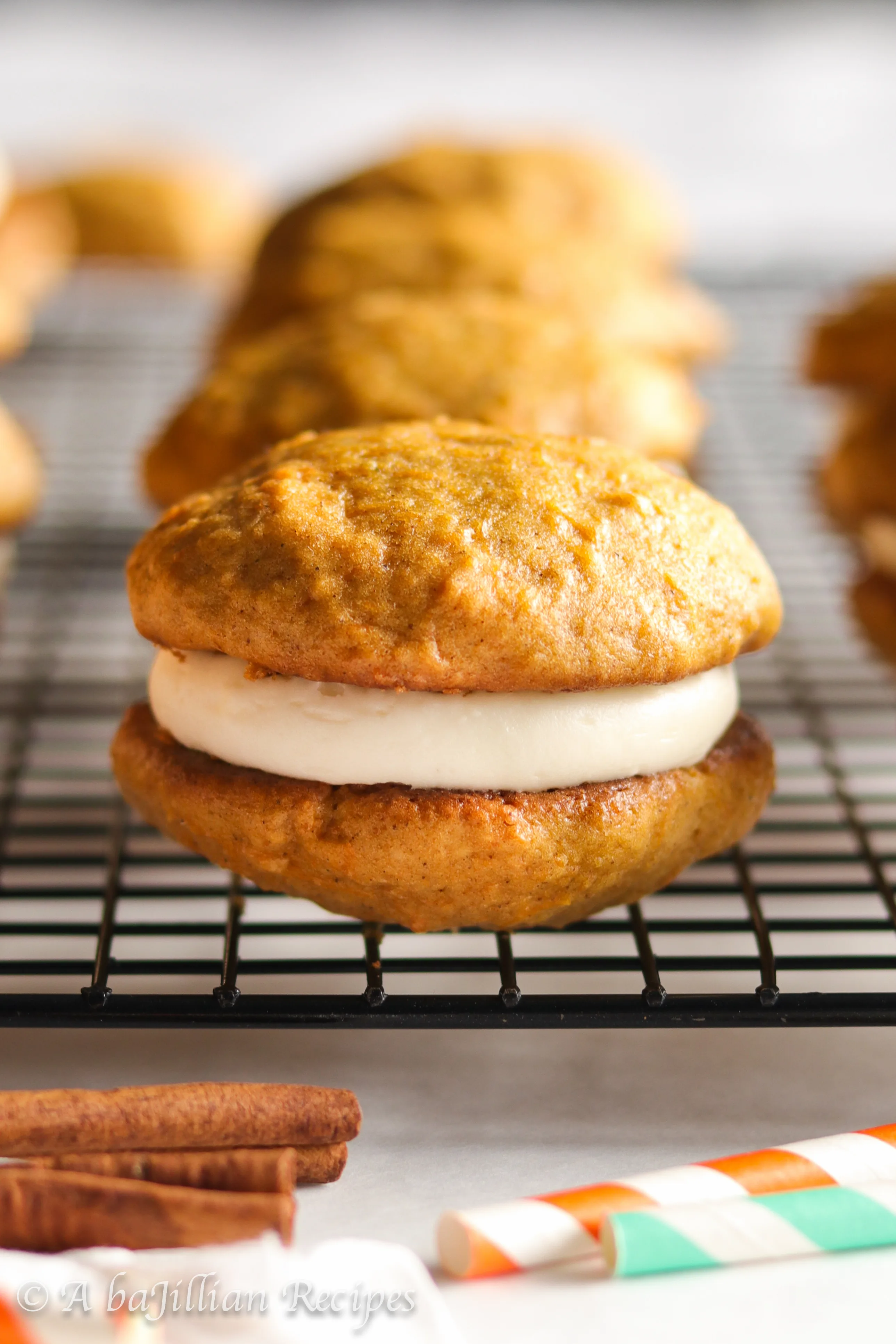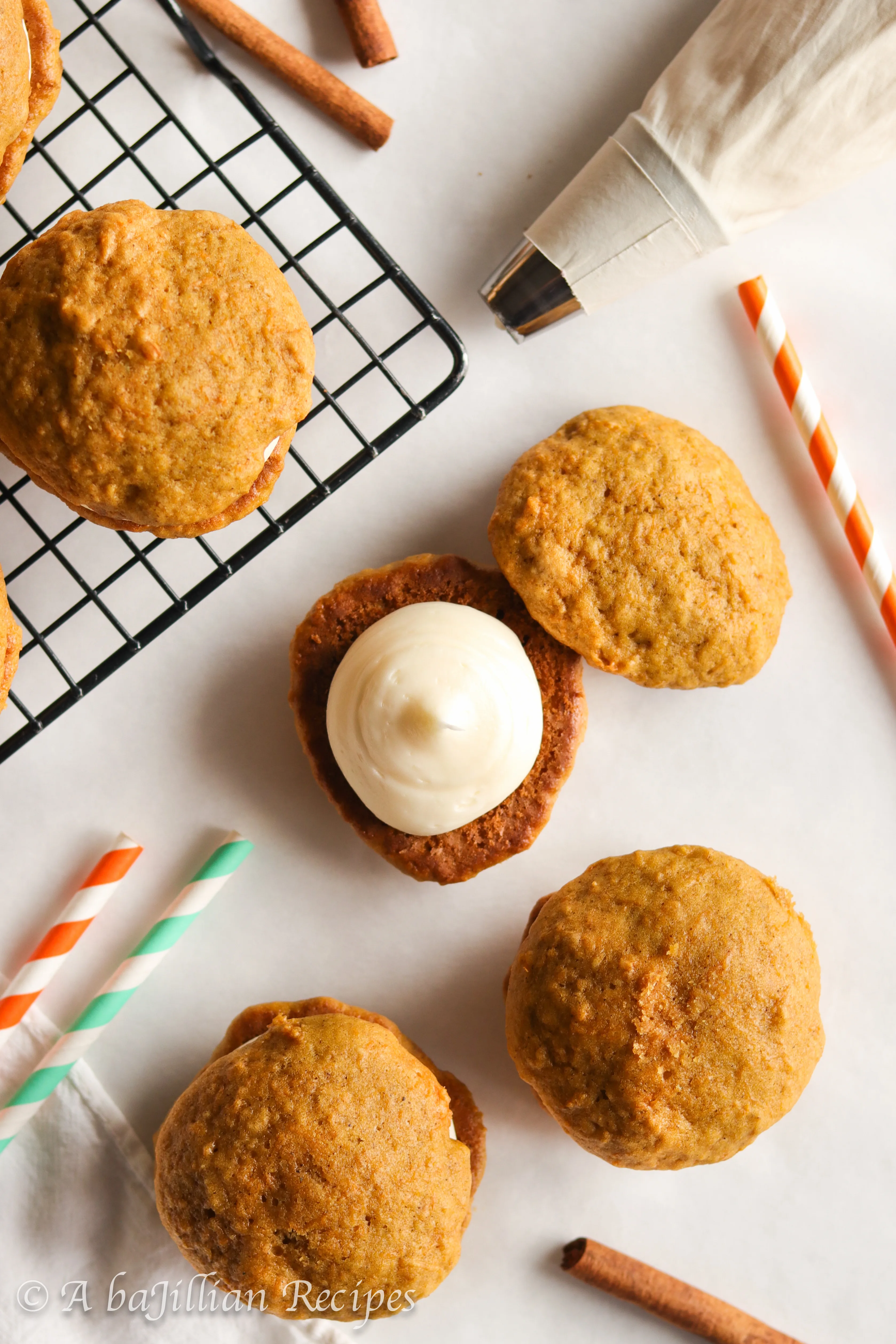 Just like red velvet cake, carrot cake is never complete without its rich and creamy counterpart–cream cheese frosting! So I made EXTRA sure to fill these whoopie pies with a generous amount.