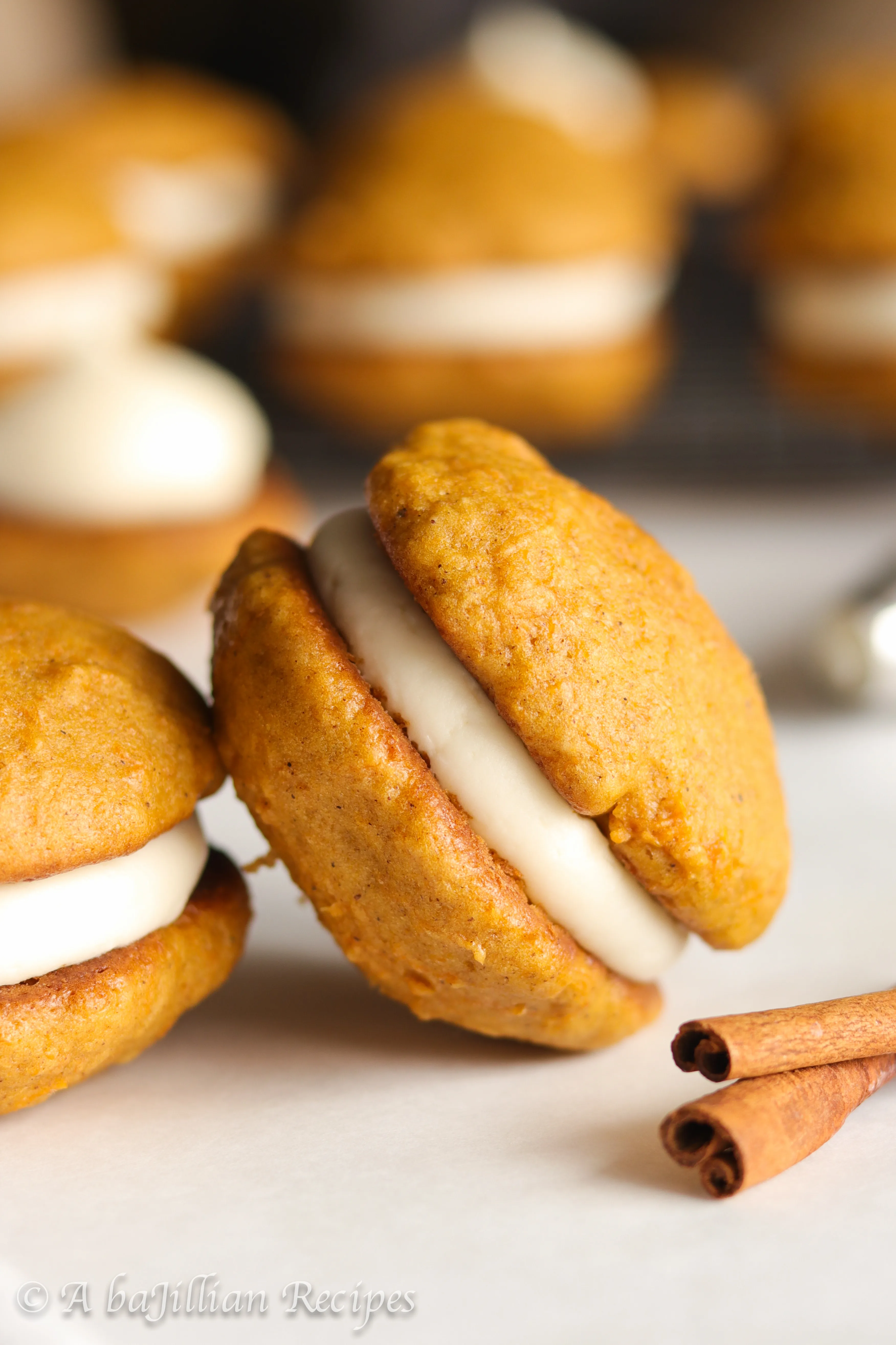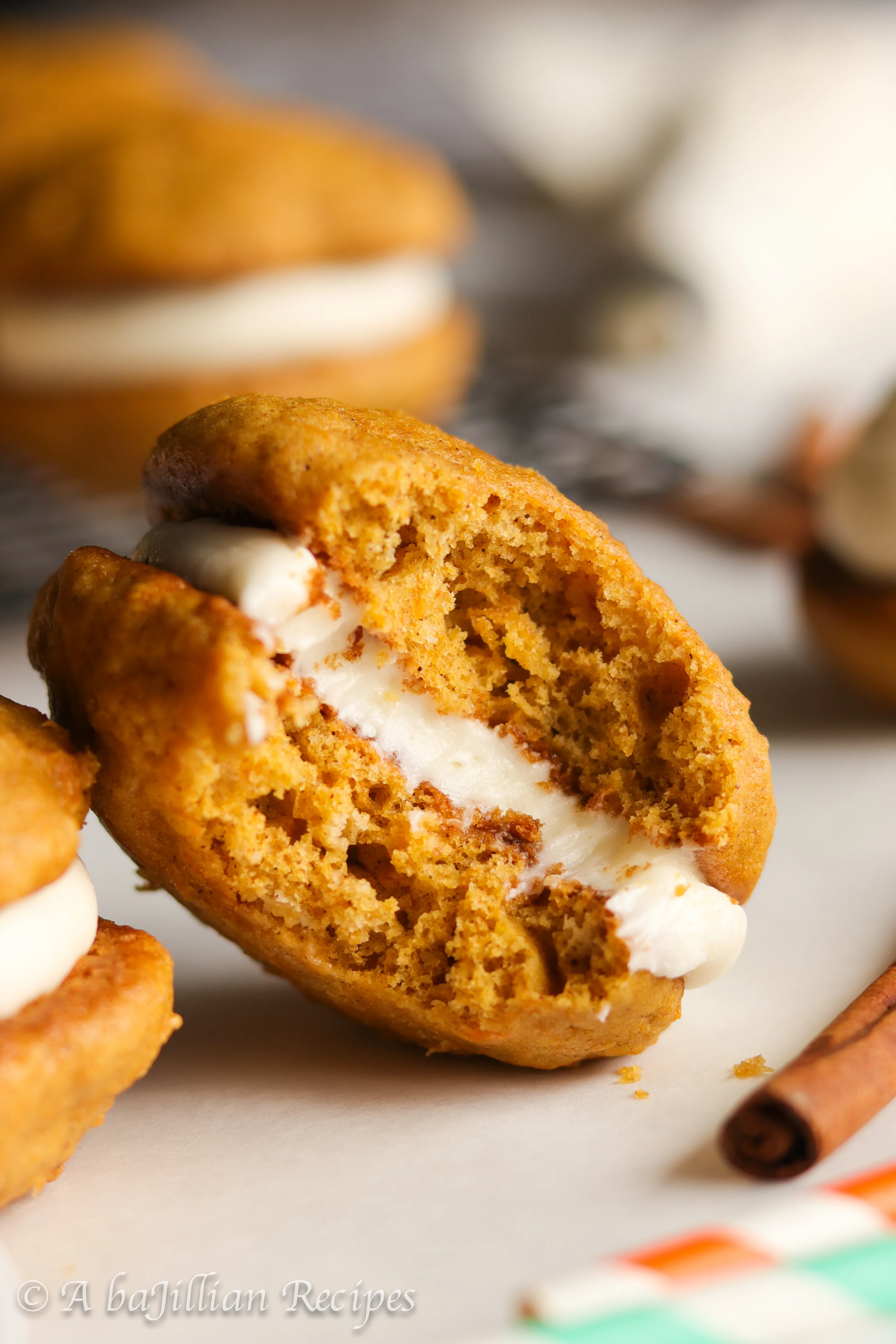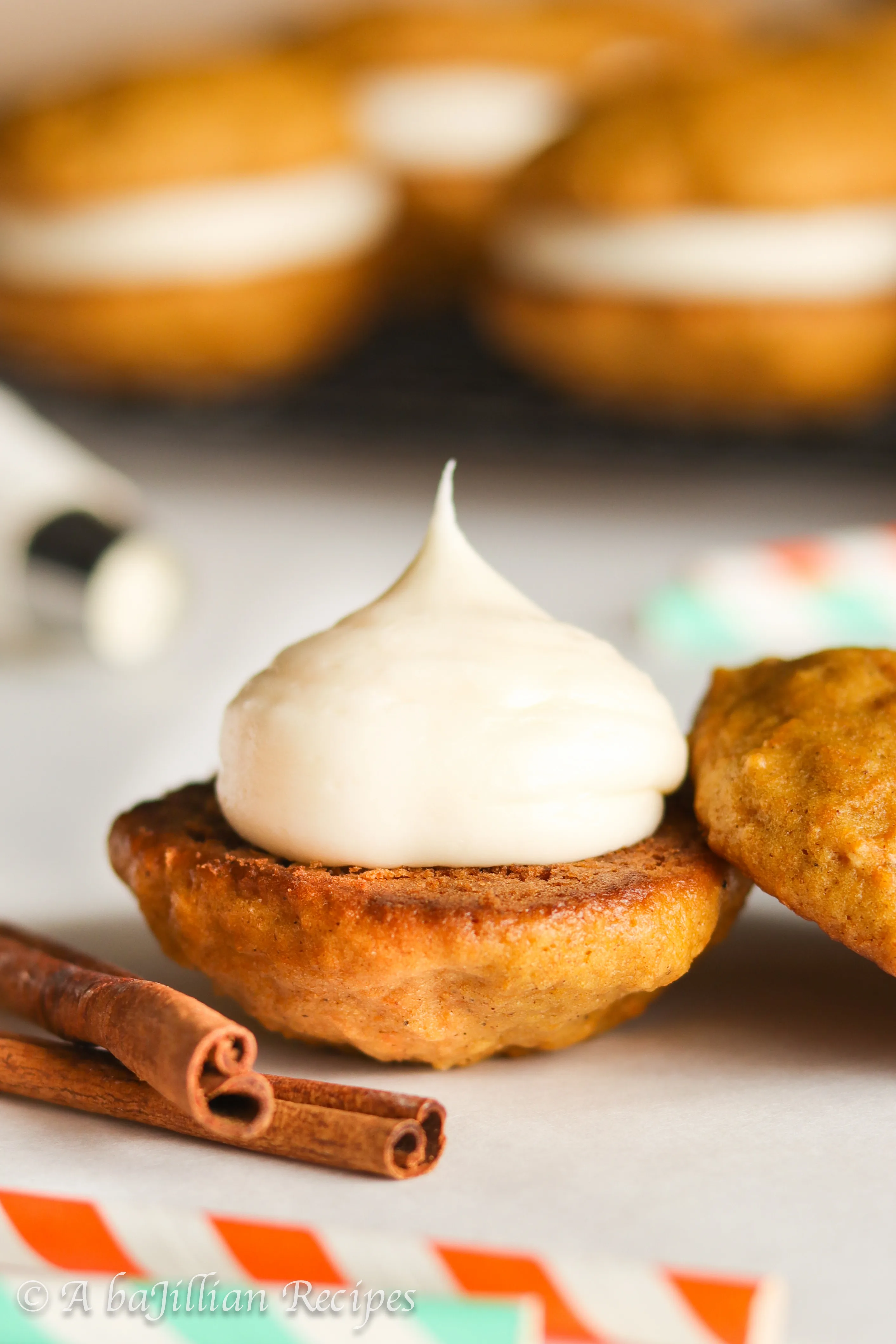 Just like red velvet cake, carrot cake is never complete without its rich and creamy counterpart–cream cheese frosting! So I made EXTRA sure to fill these whoopie pies with a generous amount.