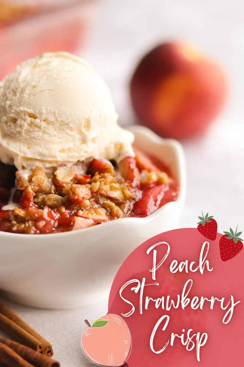 - Evenly crumble the crisp topping over the peach strawberry filling. Bake for 35-40 minutes, or until bubbly and golden brown on top.