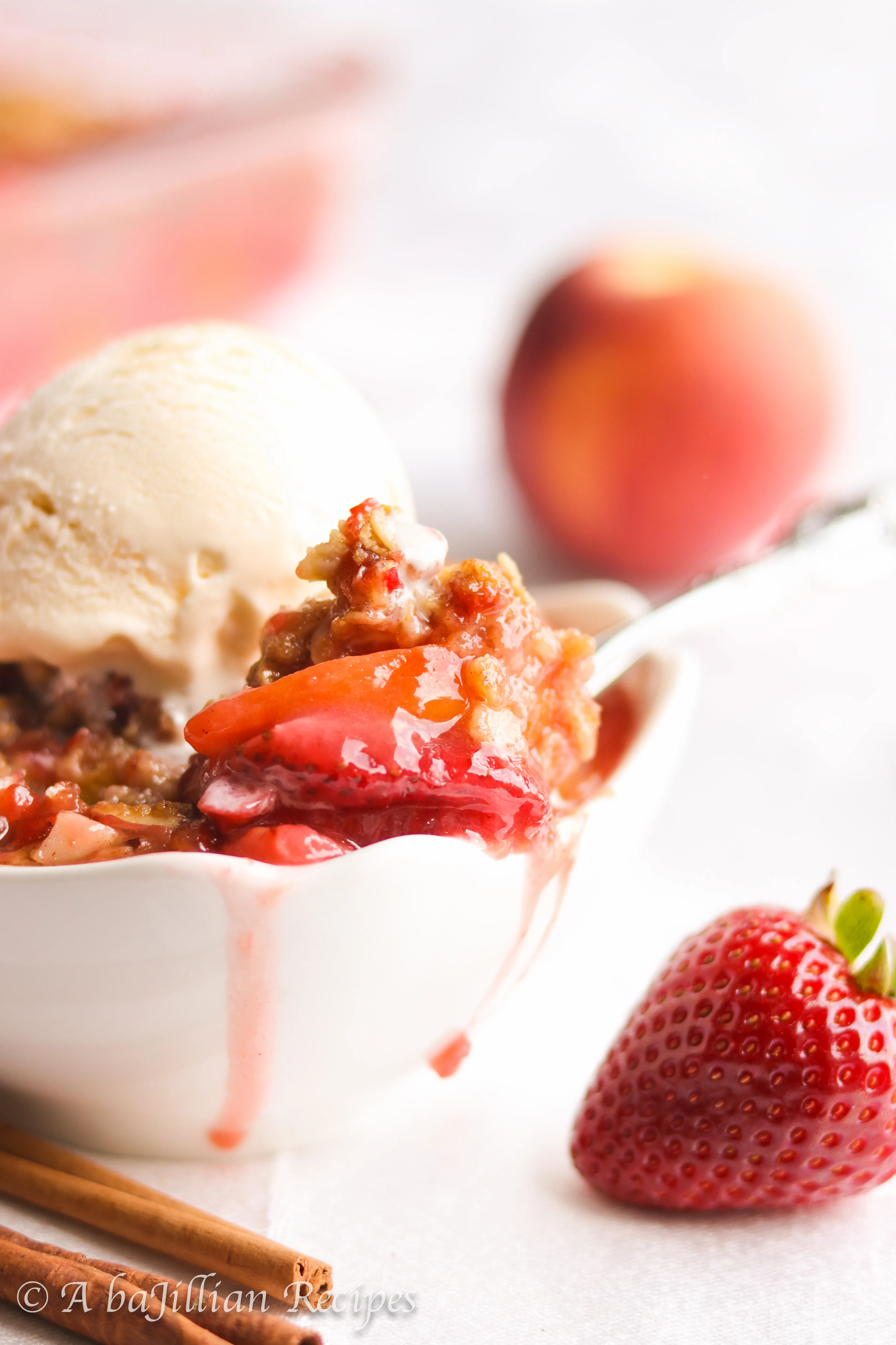 So with peach and strawberry season upon us, I decided to combine the two by baking up a deliciously drop dead gorgeous crisp.