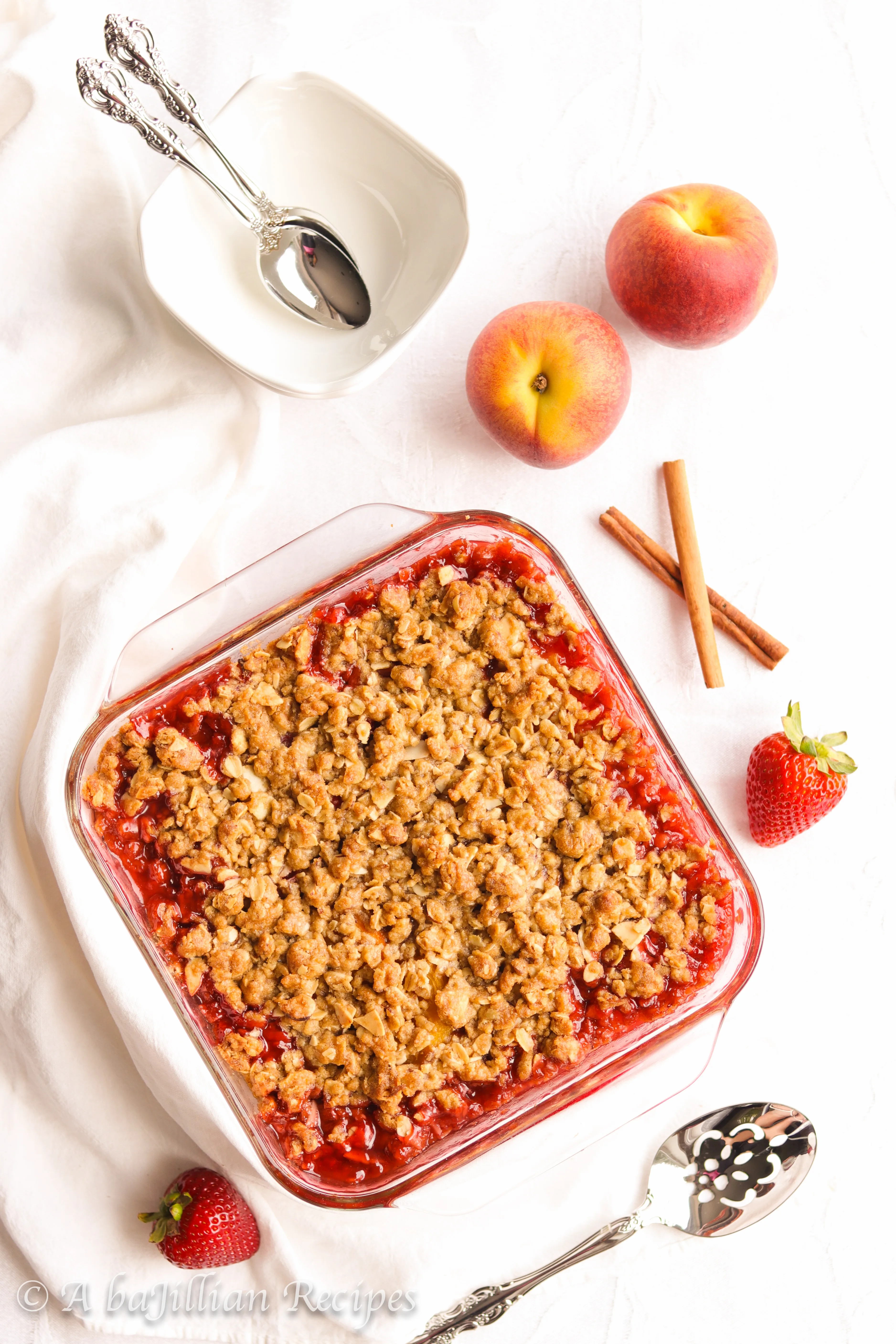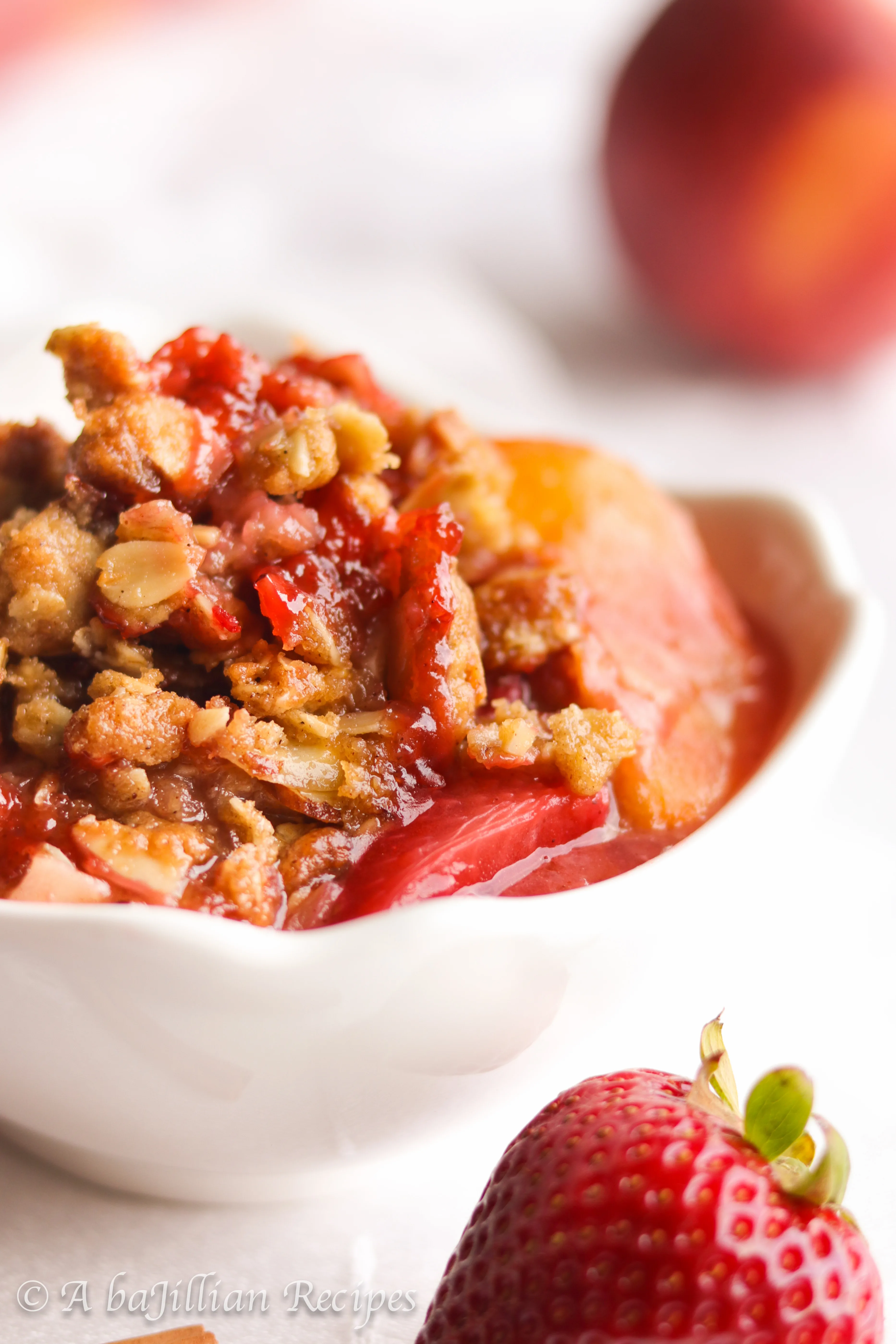 Fresh peaches and strawberries baked to sweet perfection underneath a buttery crisp topping of hearty oats, brown sugar and sliced almonds!
