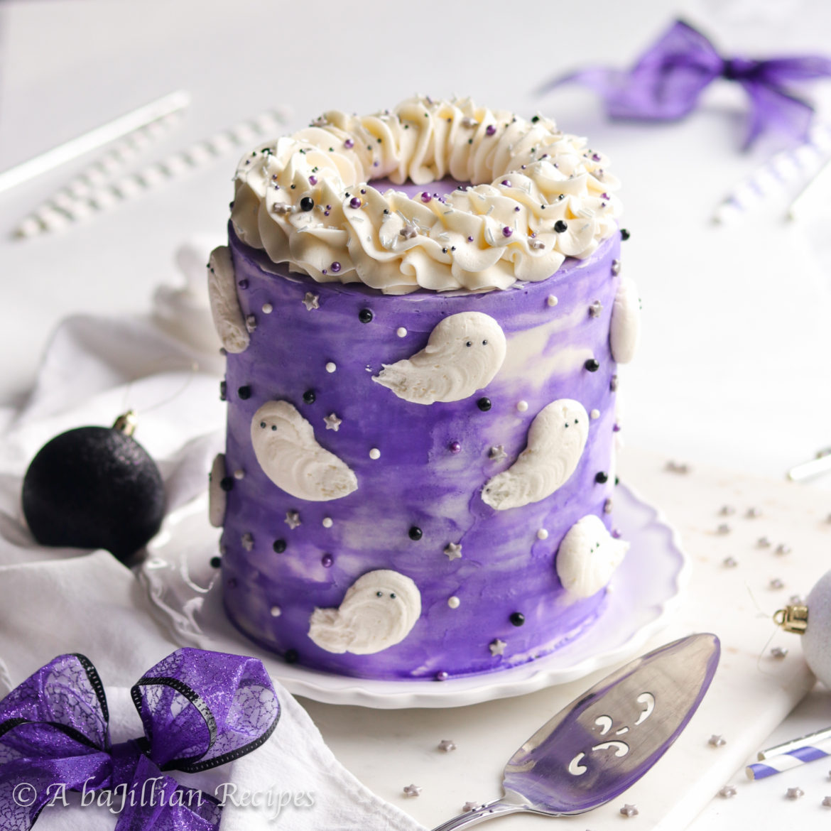 - To make the ghosts, transfer some white buttercream to a large piping bag fitted with a large round tip (I used Ateco #807). Take the piping bag and position the piping tip close to the side of the cake. Using a little pressure, squeeze the piping bag until a circle of buttercream forms on the side of the cake, then slowly drag to create a little curl as you lessen the pressure and pull away from the cake. Add black sprinkles for the eyes.