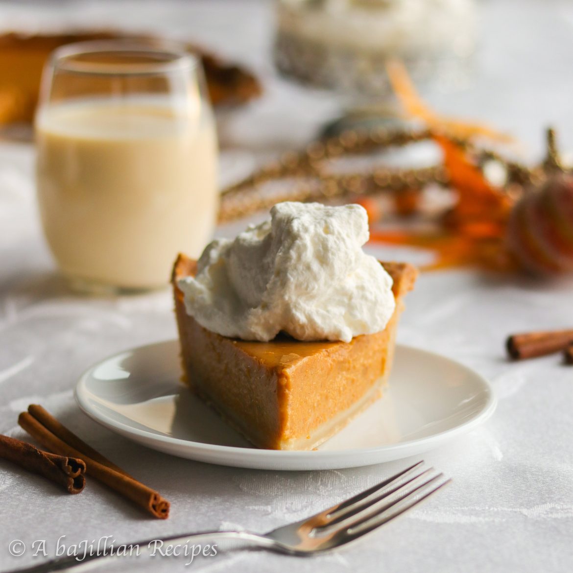 Smooth and perfectly-spiced pumpkin custard filling infused with luscious eggnog and baked in a golden flakey pie crust!
