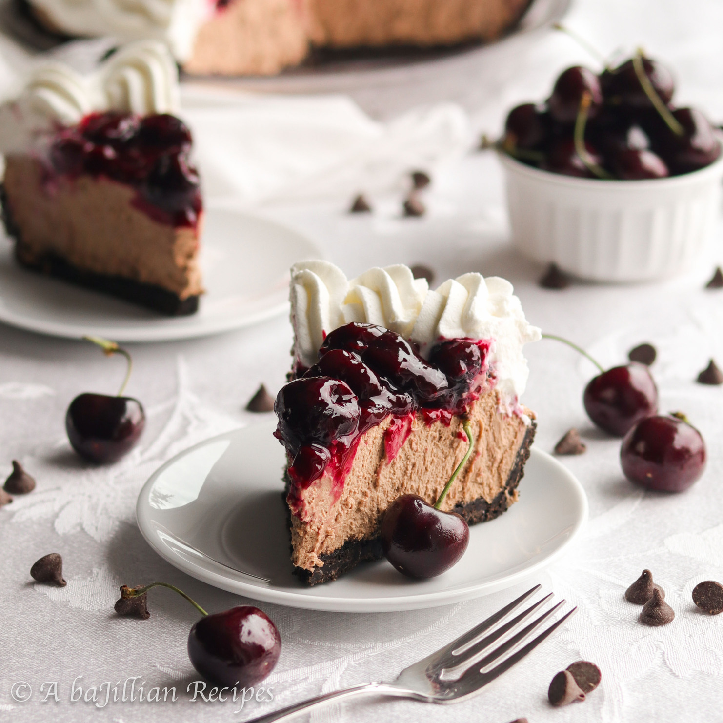 A crisp chocolate cookie crust filled with smooth, velvety chocolate filling, and topped with homemade cherry sauce!