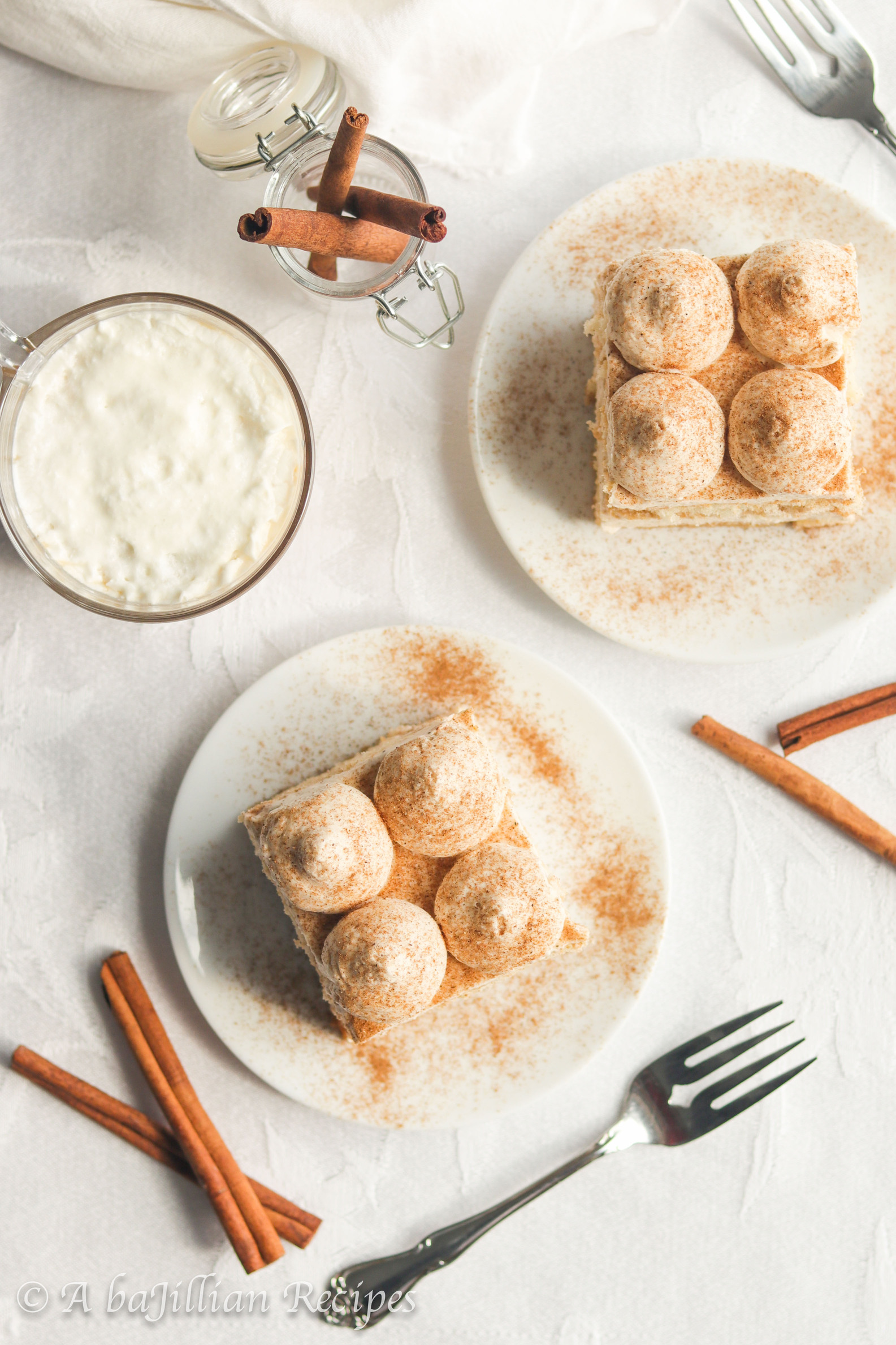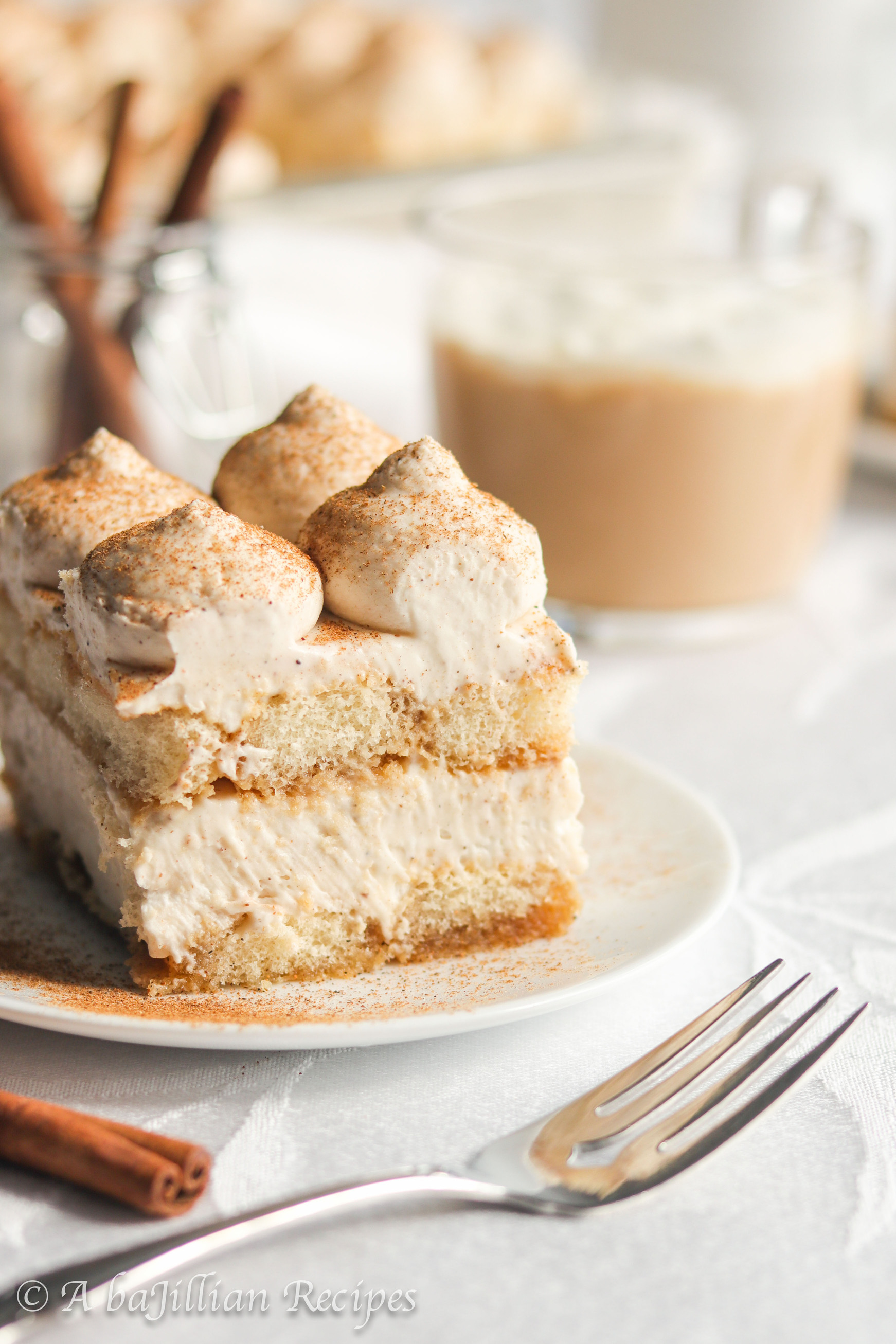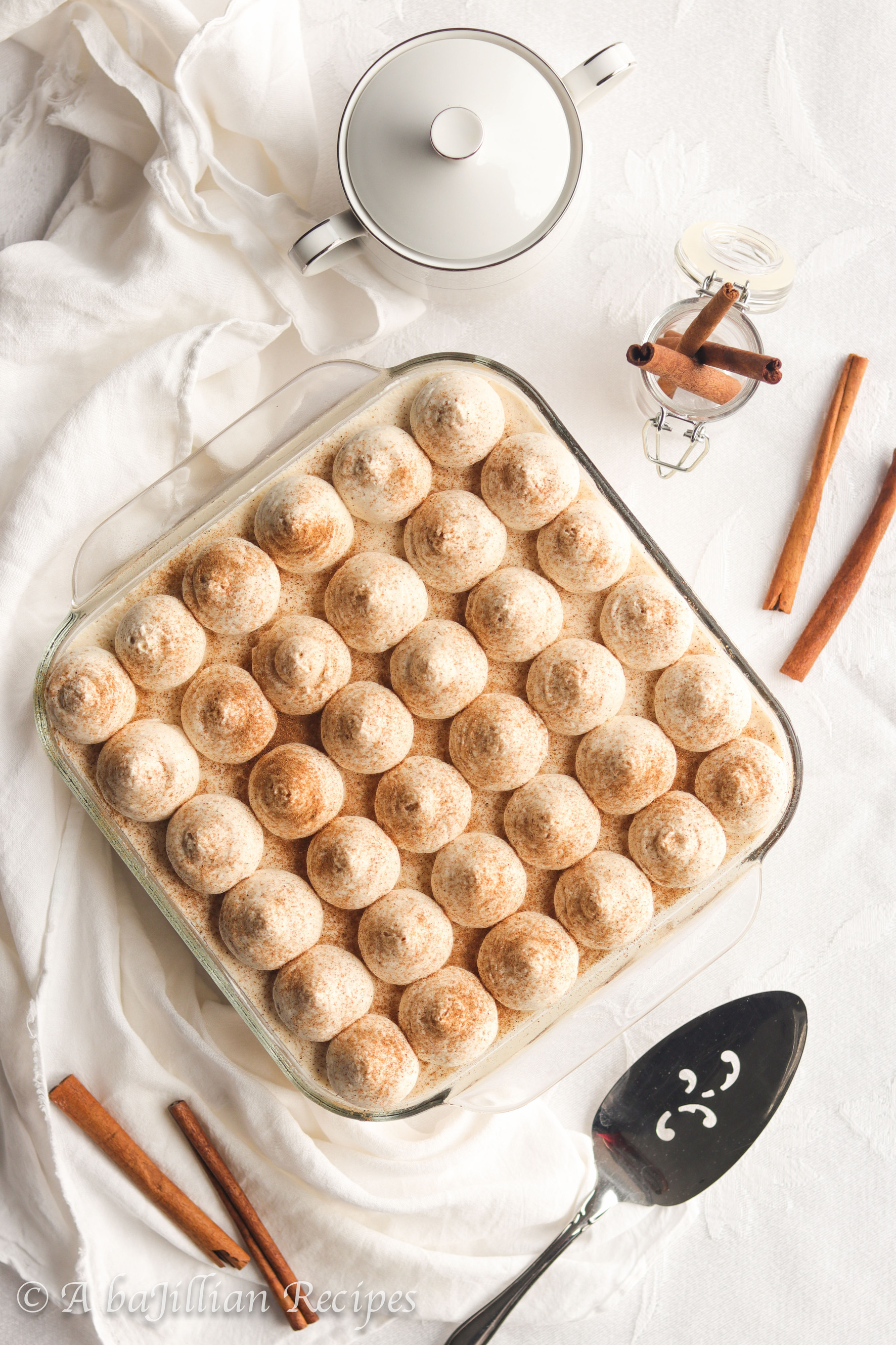 Dip, don’t submerge: When working with the ladyfingers, just dip both sides into the chai syrup, then place them into the baking dish. It’s not necessary to keep them submerged in the syrup since they soak it up pretty quickly. You also don’t want to end up with soggy ladyfingers. If you want, you can drizzle 2-3 teaspoons of the syrup evenly over the ladyfingers after placing them into the dish.