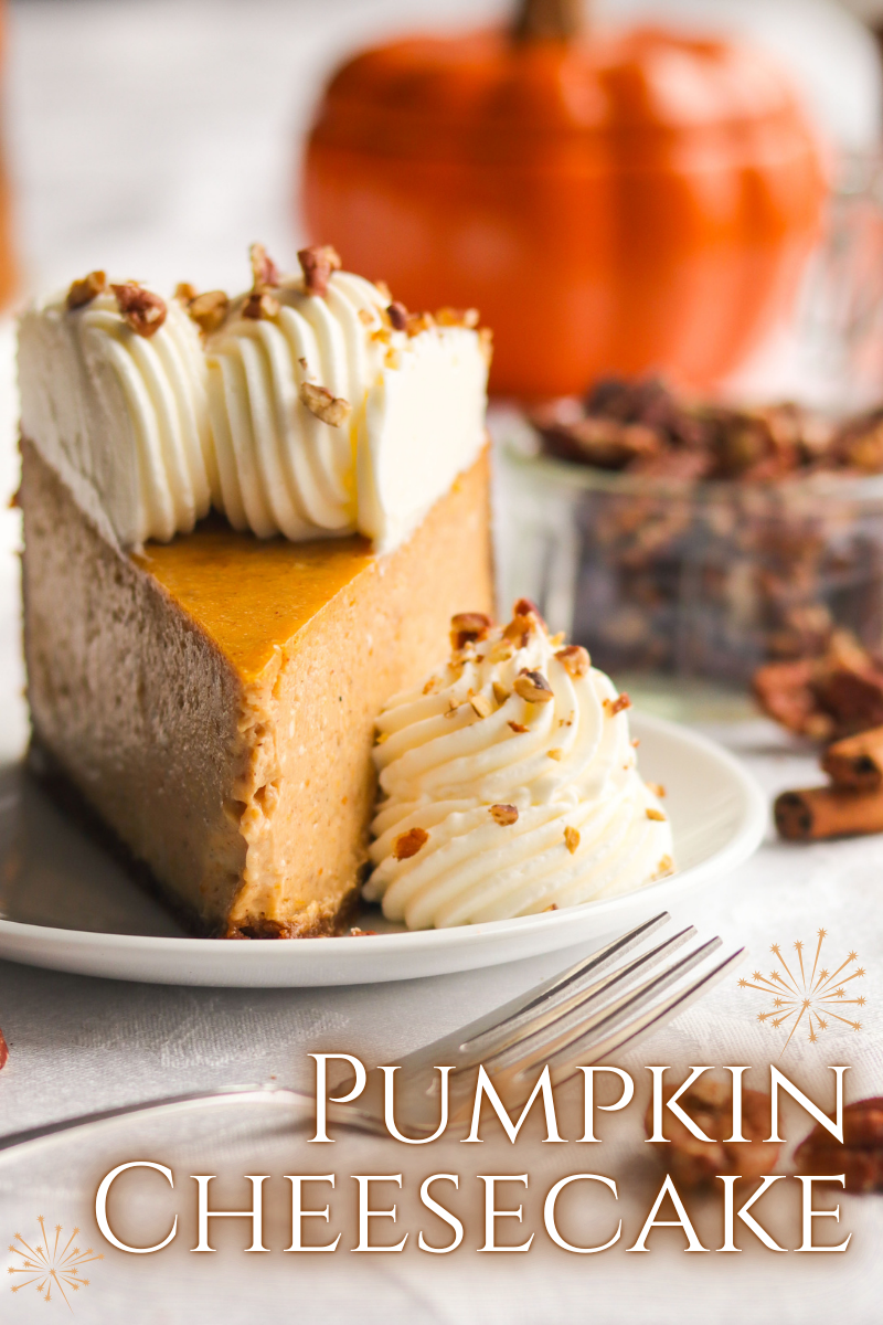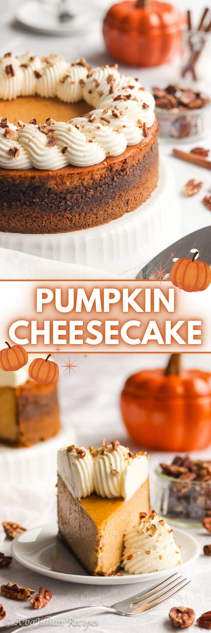 Tall, rich, and incredibly creamy, this Pumpkin Cheesecake is infused with warm spices, baked in a buttery Biscoff cookie crust, and crowned with fluffy cream cheese whipped cream!