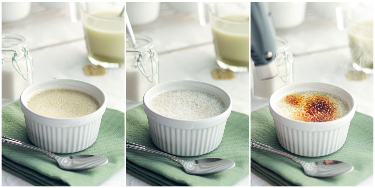- Just before serving, sprinkle about 1 teaspoon of granulated sugar evenly over each custard.** Use a small kitchen torch to caramelize the tops. Enjoy!