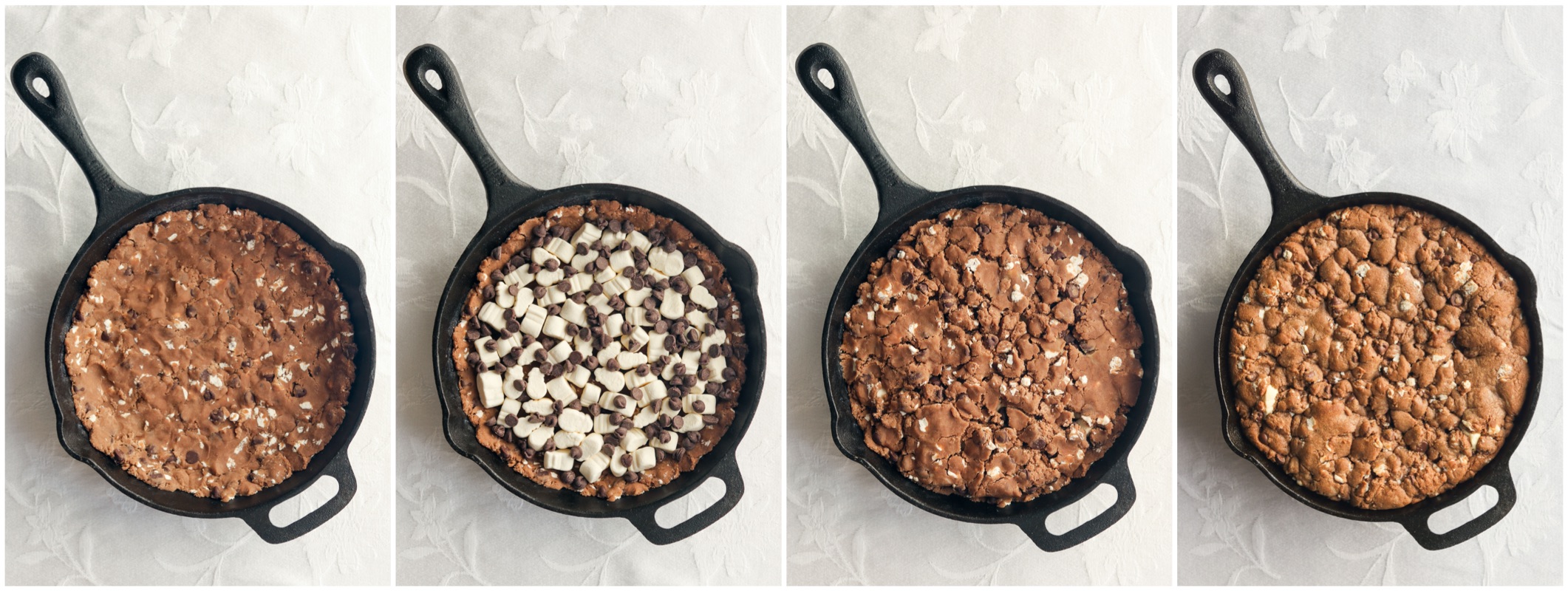 - Preheat the oven to 350ºF. Press half of the dough into a greased 10-inch cast iron skillet. Sprinkle mini marshmallows and remaining 1/2 cup chocolate chips evenly over the dough. Take chunks of the remaining dough, flatten, and layer them side by side on top of the marshmallows and chocolate chips. Try to cover as much of the marshmallows as possible.