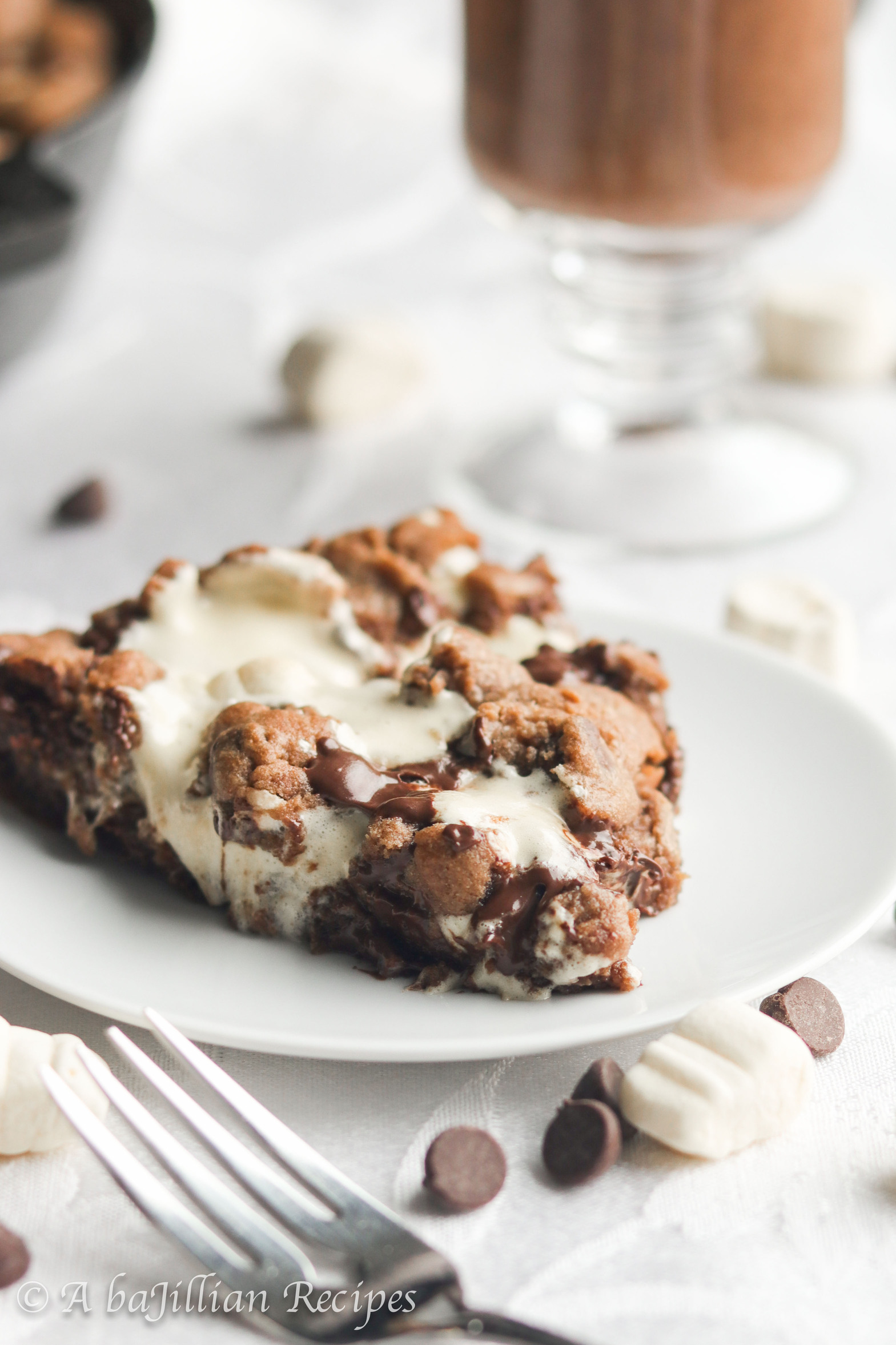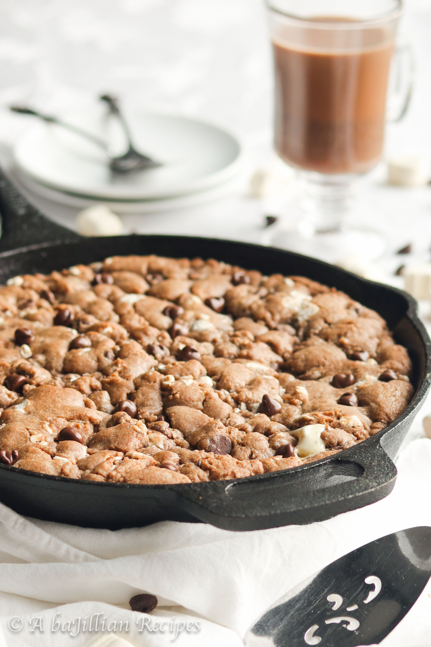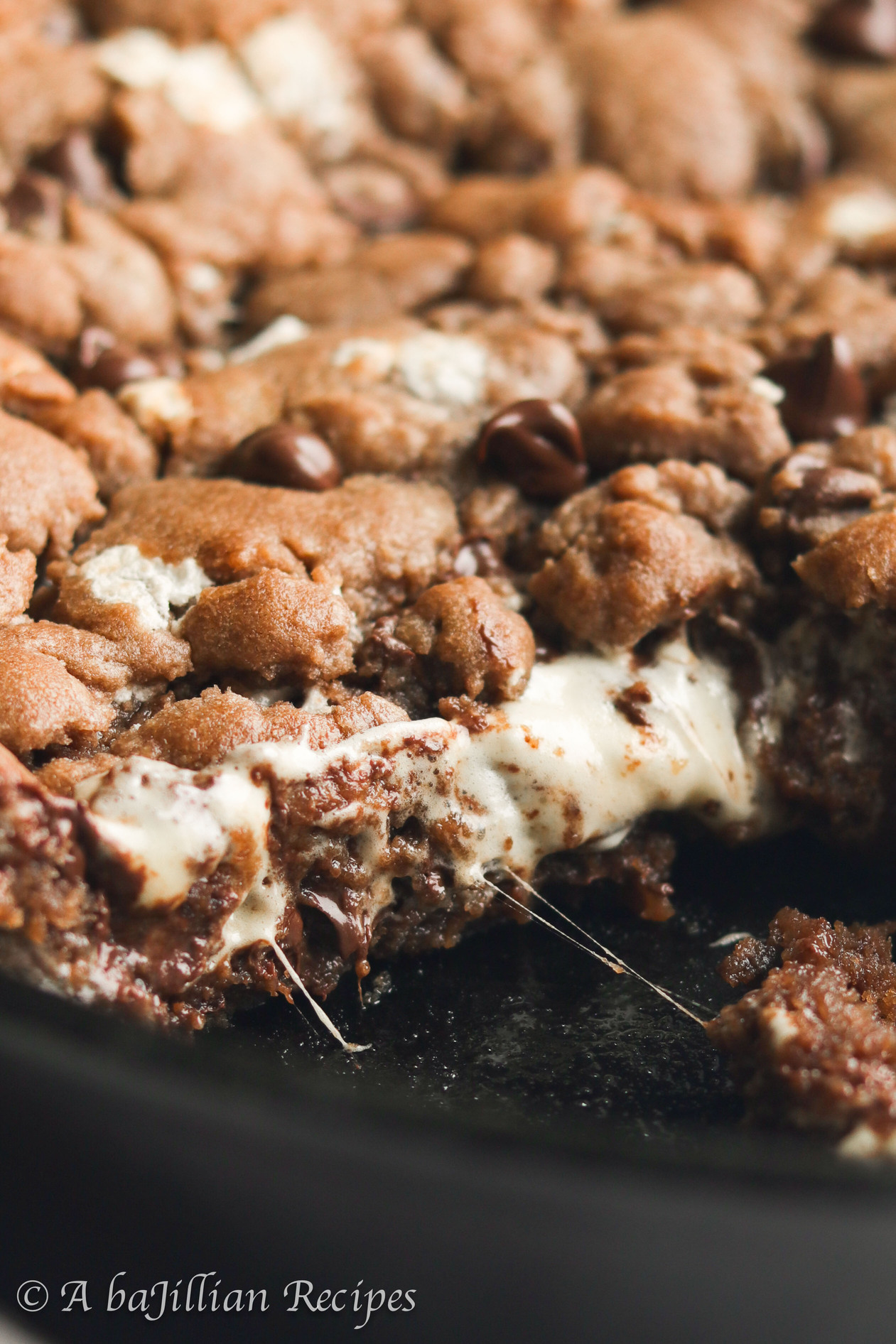 Avoid over-baking: The beauty of pizookies is that they’re meant to be extra doughy and slightly underbaked throughout. You’re basically looking for the edges to be set and slightly puffed, while the center looks barely set and slightly underbaked, if not a little shiny on top. It should jiggle a little since there’s a layer of marshmallow in the center. Keep in mind that the residual heat in the cast iron skillet will continue to cook the pizookie as it cools.