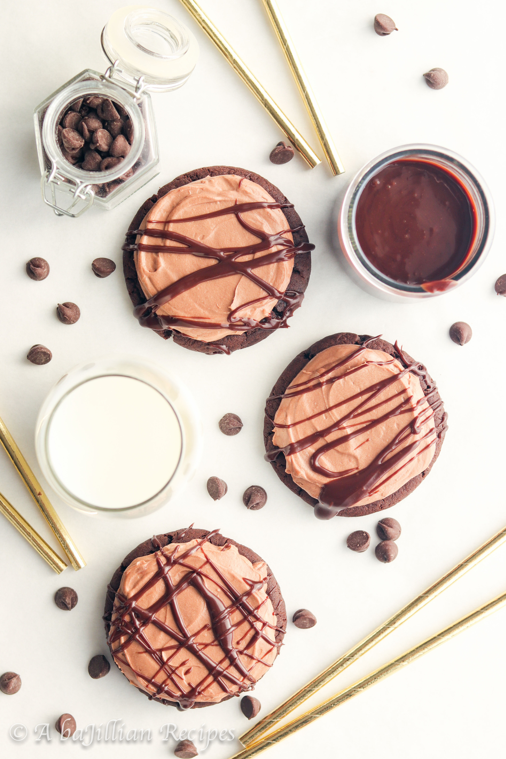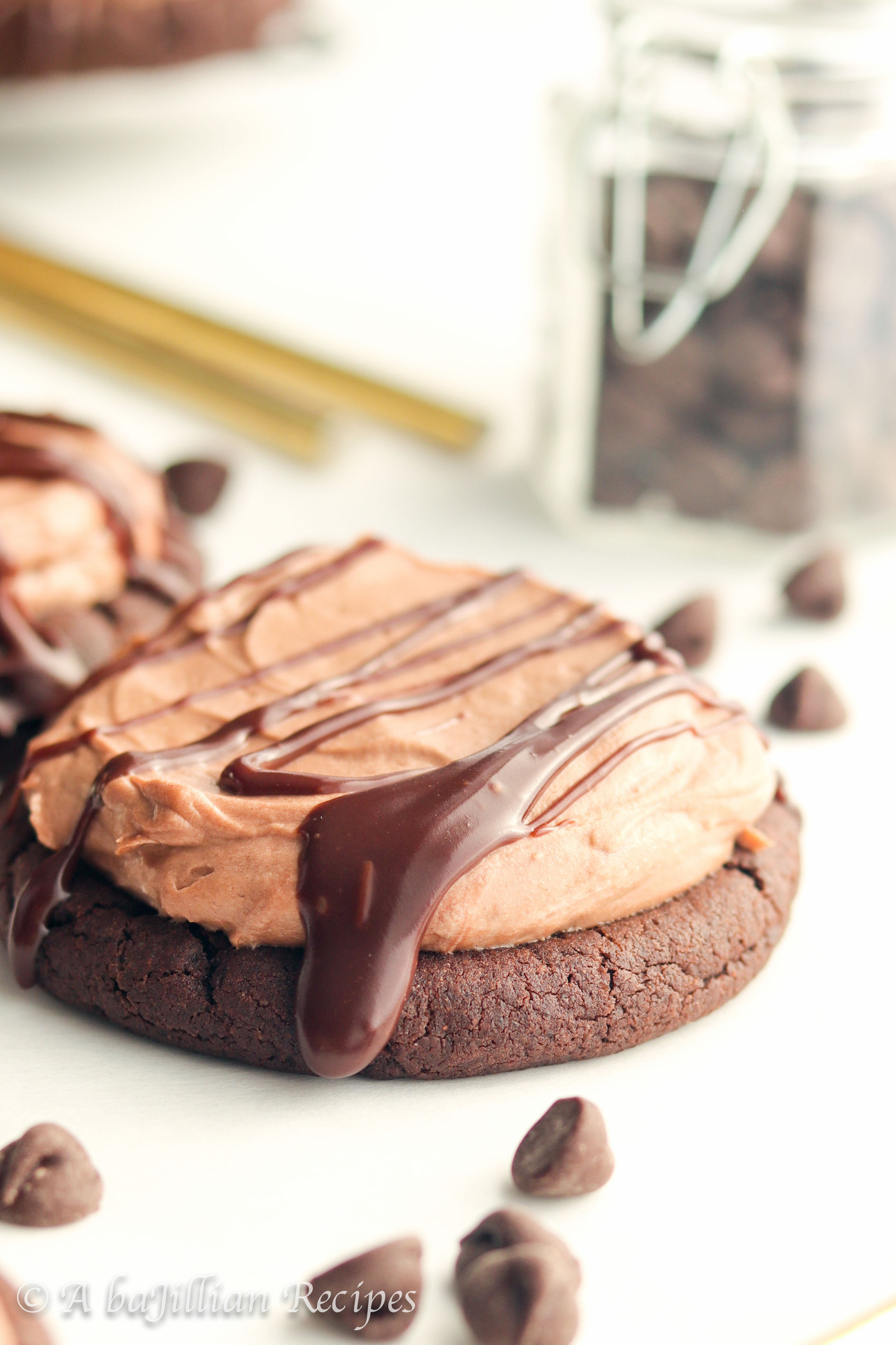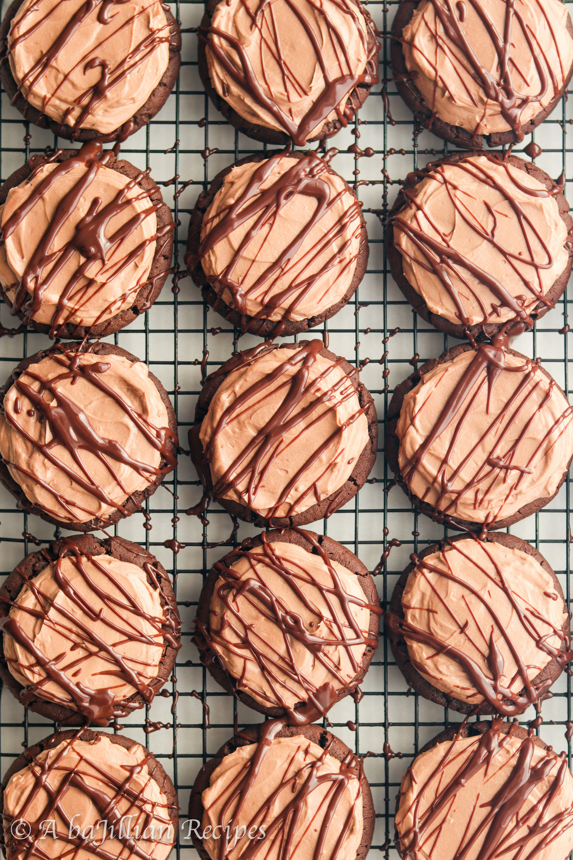 - Divide mousse evenly among each cookie, then use a butterknife or offset spatula to spread evenly. Drizzle each cookie with chocolate ganache. Serve and enjoy!