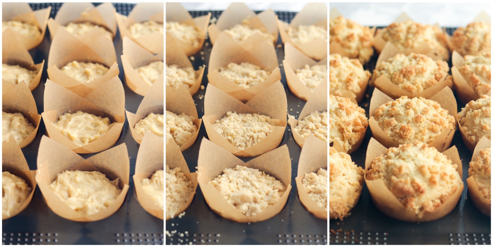 - Spoon batter into prepared muffin pan, filling all the way to the top. Sprinkle/Press streusel on top of the batter.