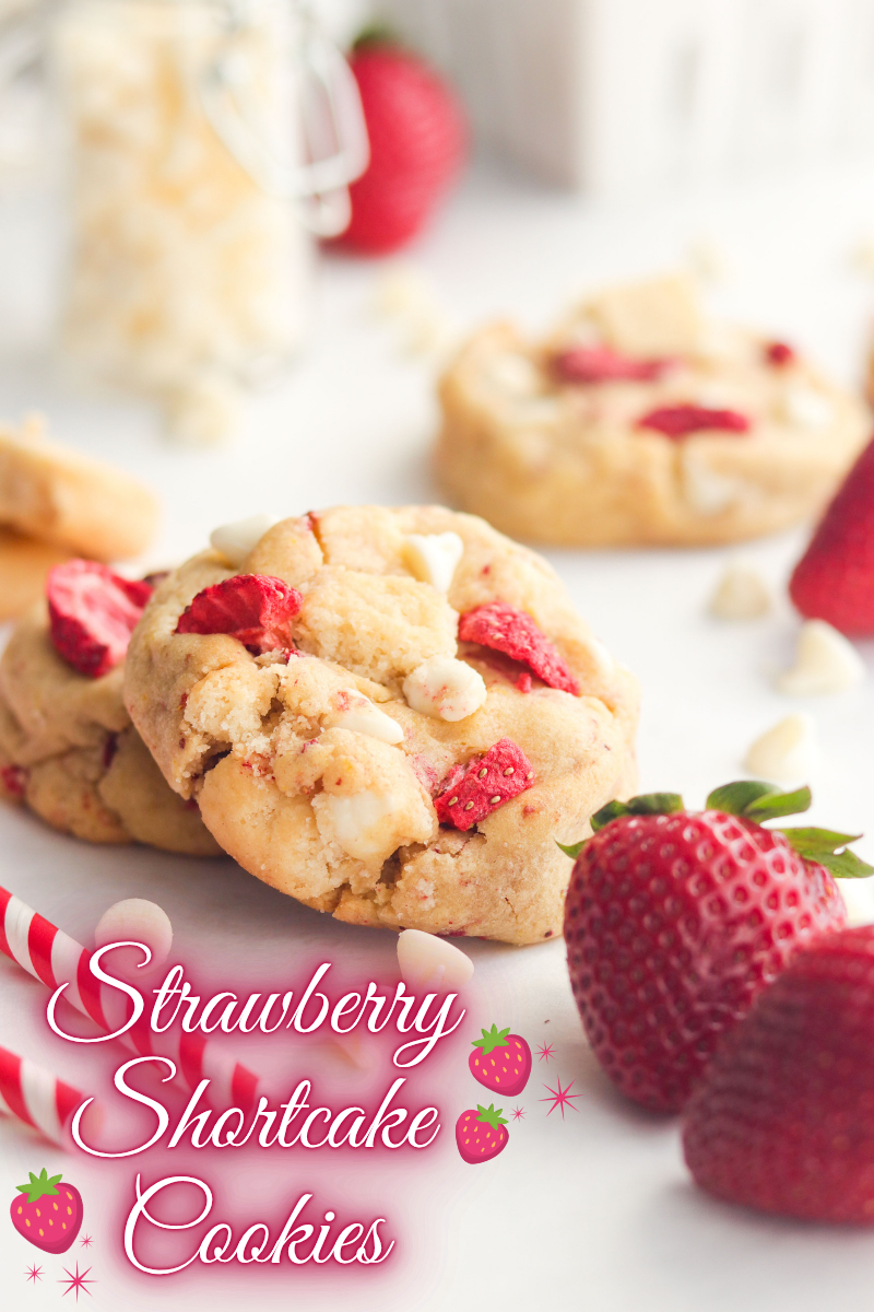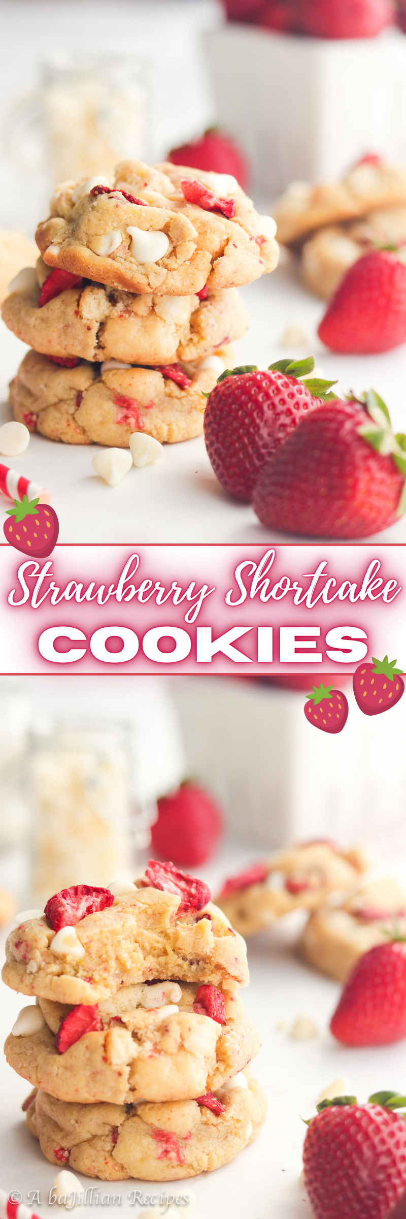 These Strawberry Shortcake Cookies are soft, thick, and brimming with white chocolate chips, buttery shortbread cookies, and freeze dried strawberries!